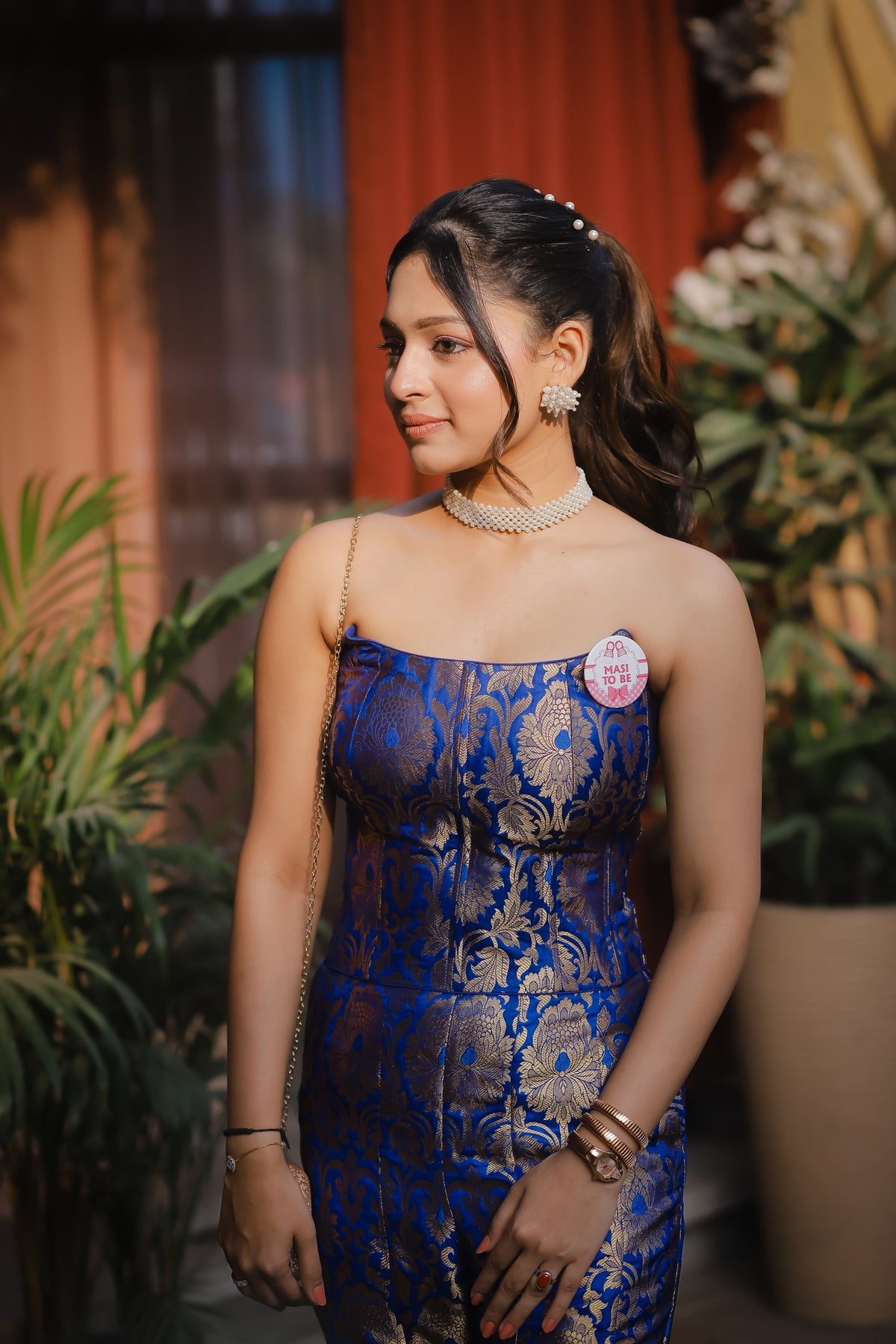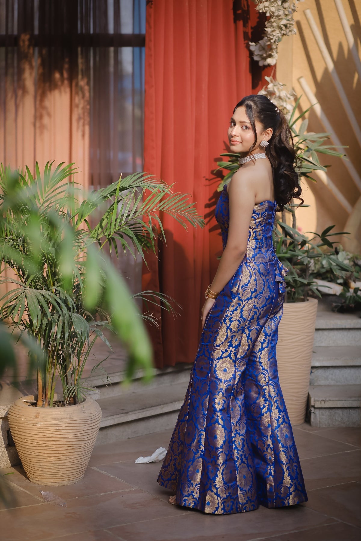 Pure Jamawar royal blue corset set paired with a retro sharara. The fabric’s intricate floral pattern lends a luxurious and refined appeal. The fitted bodice with a softly curved neckline creates a modern silhouette, while the fluid sharara adds effortless grace. Regal yet minimal, this ensemble is perfect for formal gatherings and festive occasions.