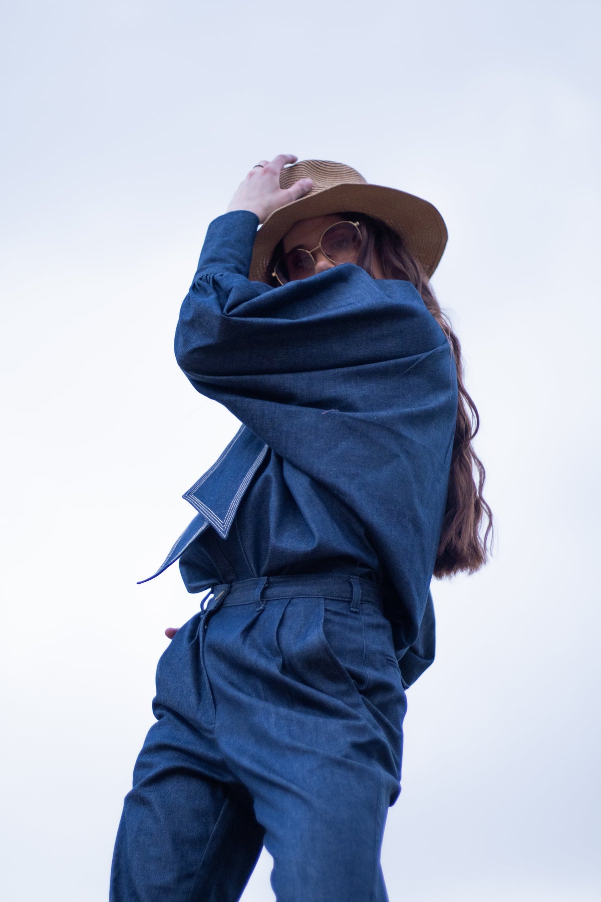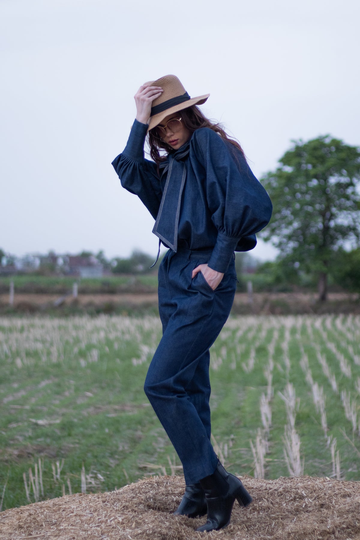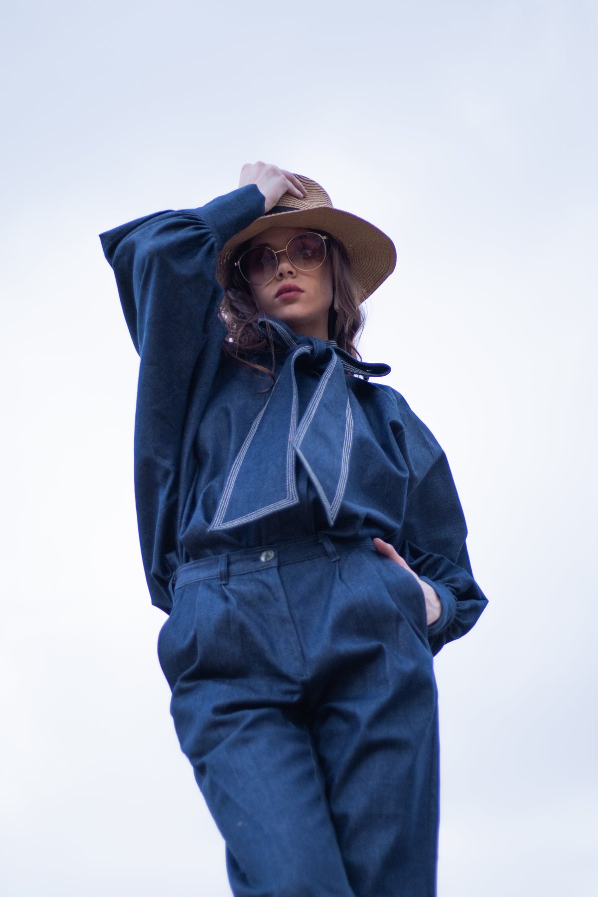 Step out in effortless style with this unique denim pant and kimono top set. The top features a denim neck ribbon that ties into a charming bow, highlighted with white thread stitch edging for an elevated finish. The boho-inspired sleeves come with cuff openings and discreet zippers for ease and comfort. Paired with relaxed-fit denim pants designed with handy side pockets, this ensemble is perfect for all-day wear.