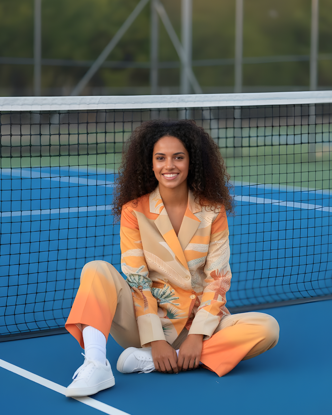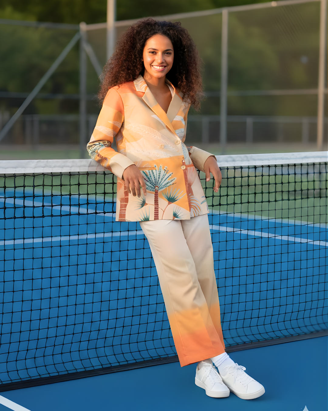 A coconut print Chanderi silk lapel collar blazer paired with matching straight pants offers a unique and refreshing look. The distinct placement of the print ensures you stand out in any crowd while carrying the outfit effortlessly. The soothing colors of the print add to the ensemble's appeal, making it both stylish and comfortable.