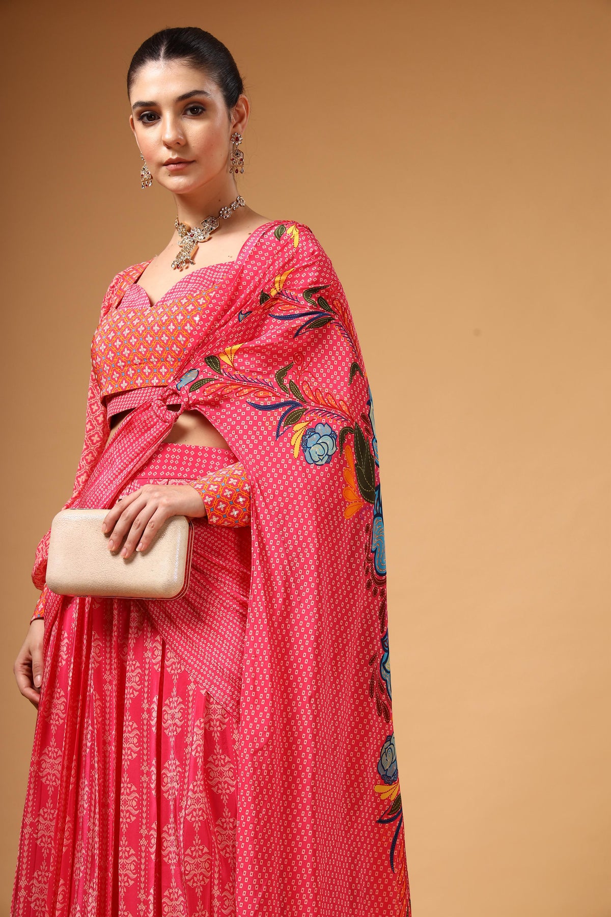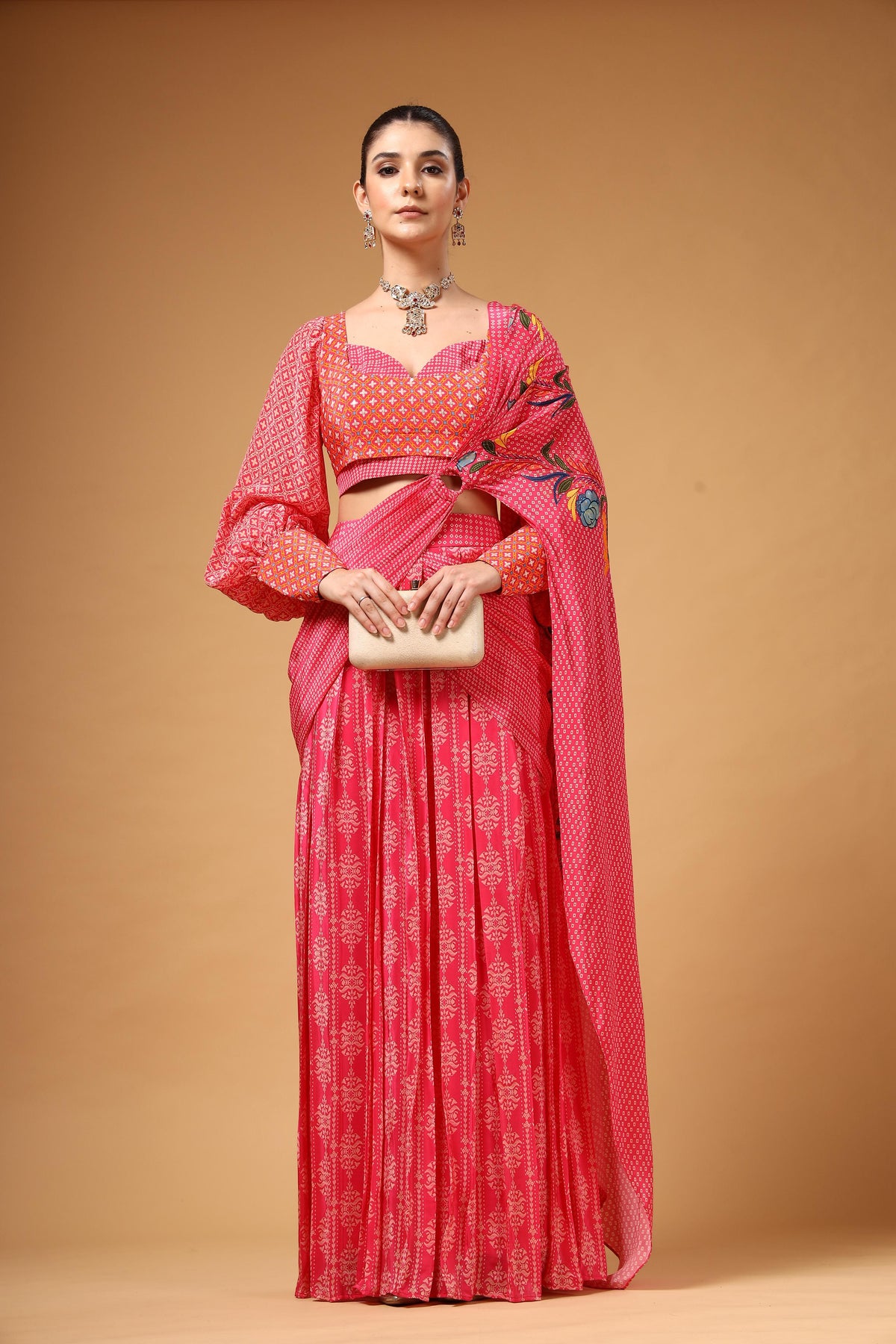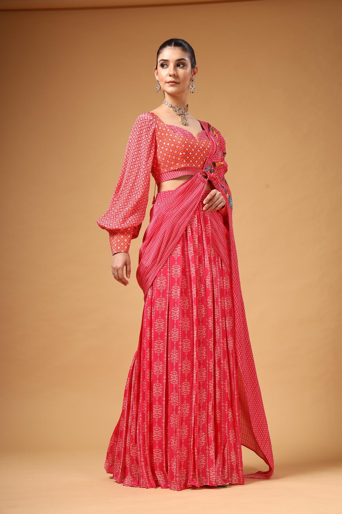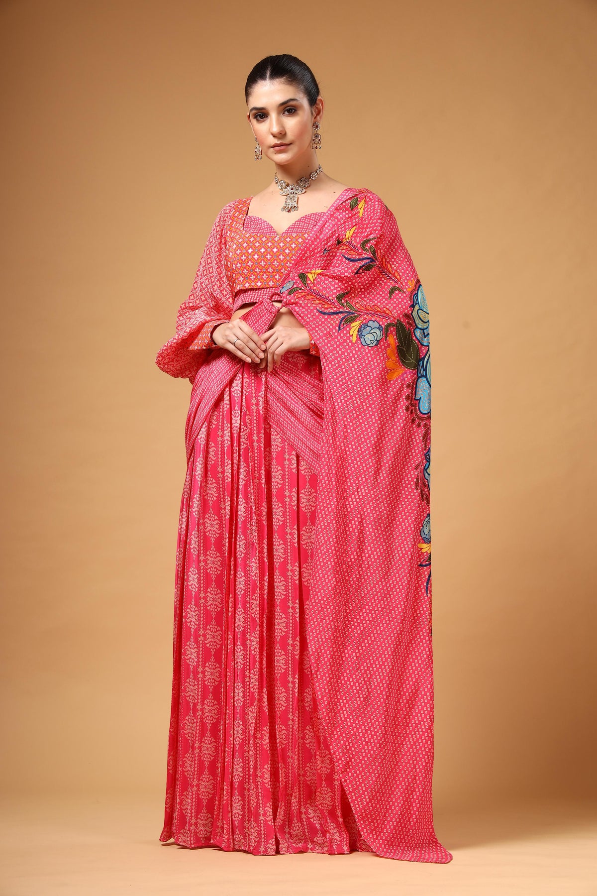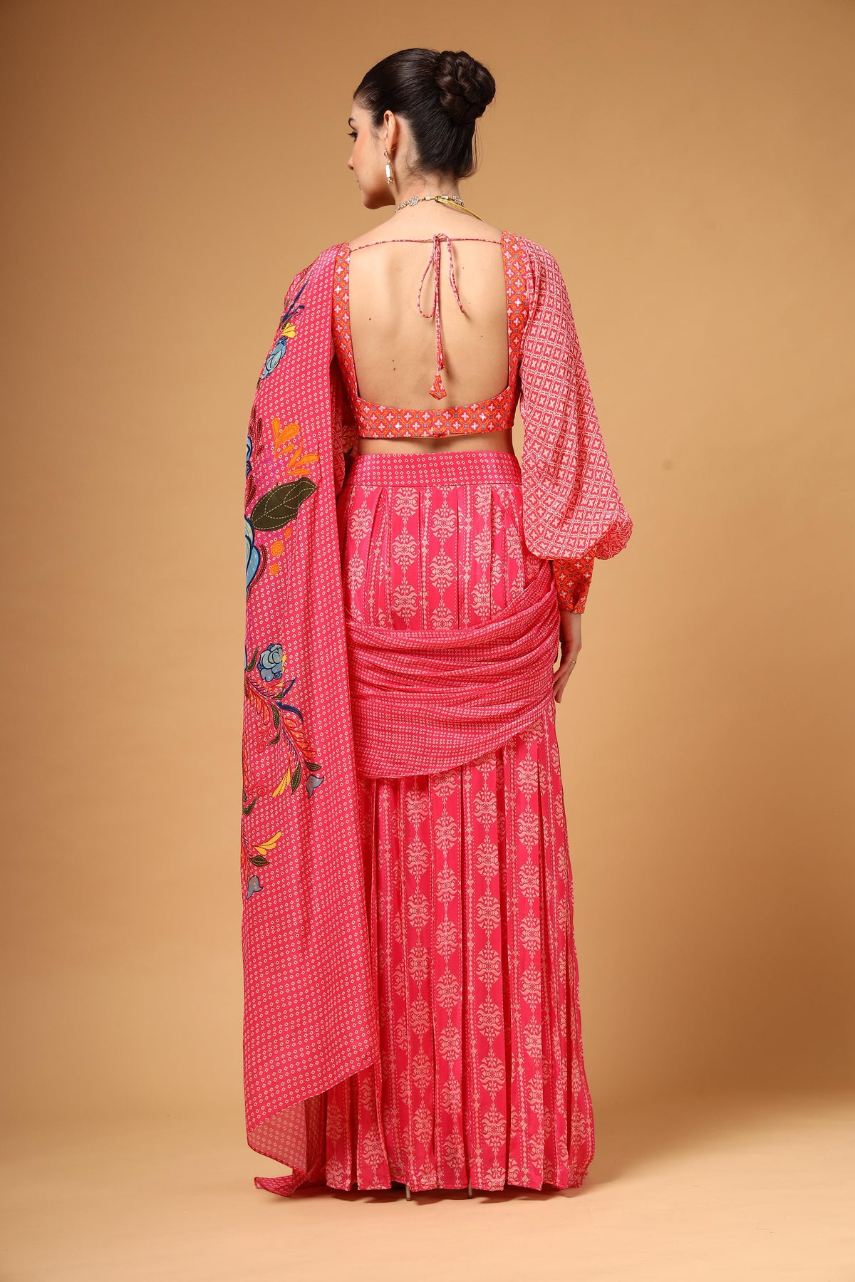 A pre-draped saree with a boho sleeved blouse, featuring double print layers for added texture and charm. The pallu blooms with multi-colour floral motifs, while a statement waist ring adds an unexpected, eye-catching detail. A playful blend of artistry and elegance.