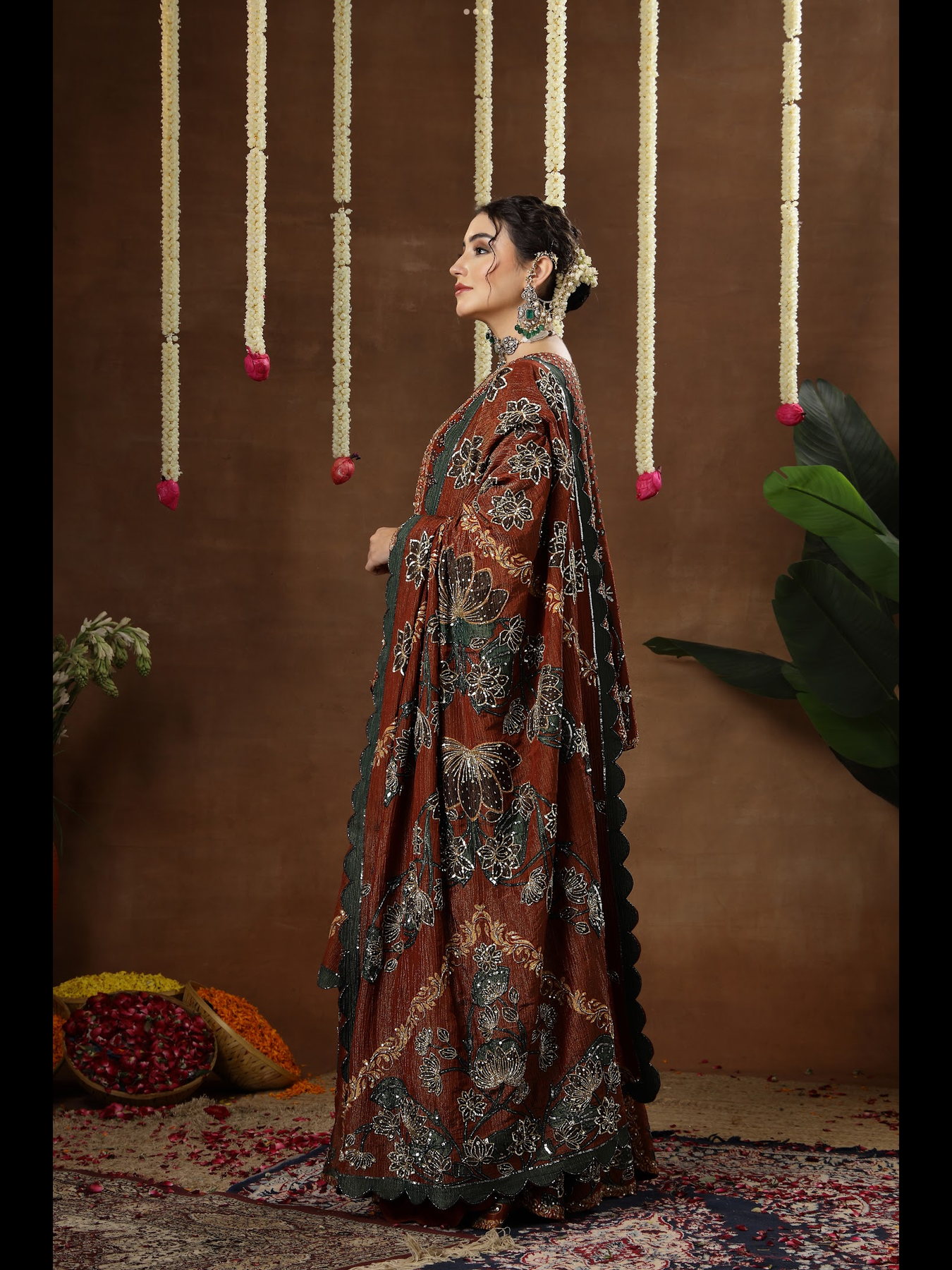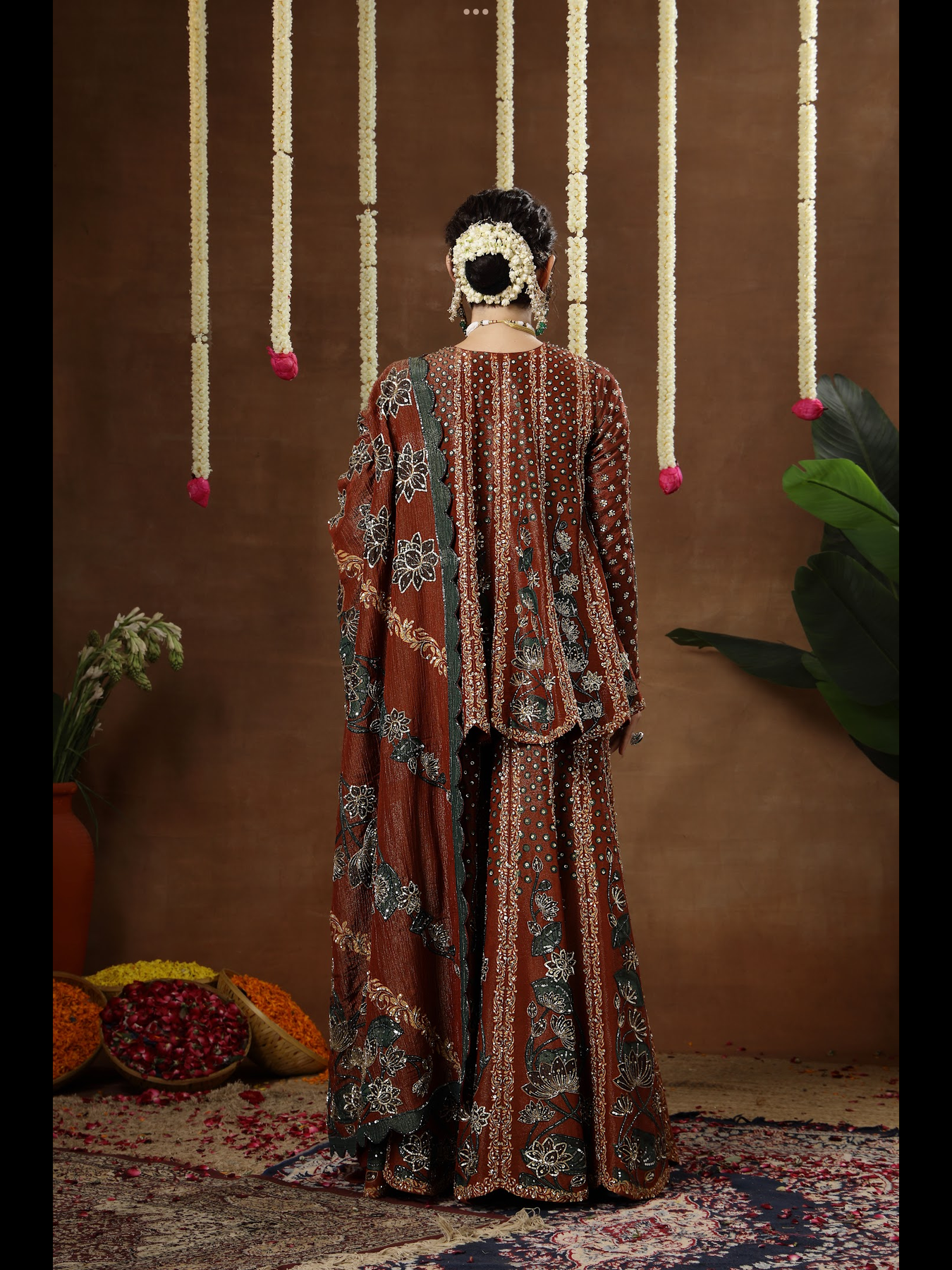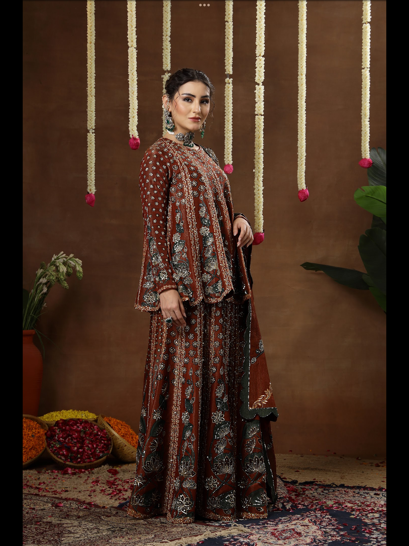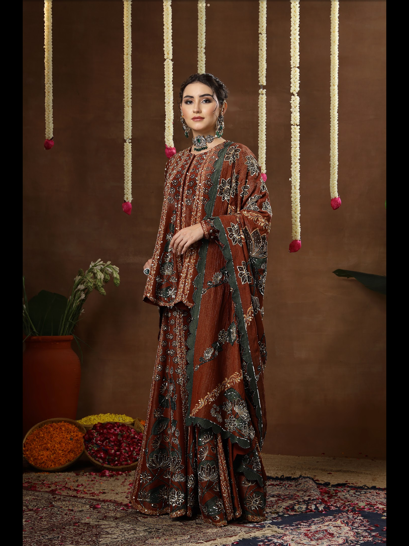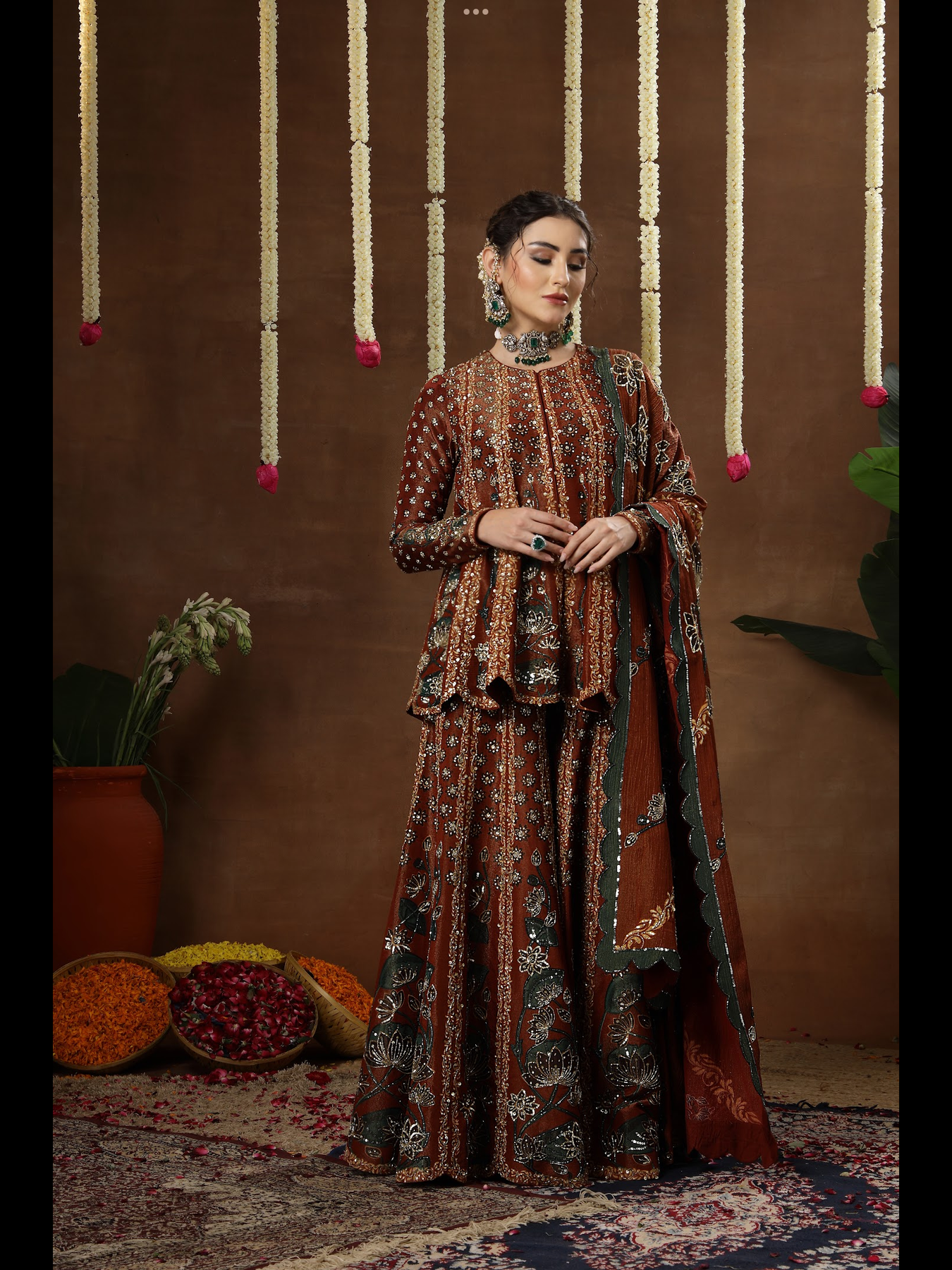 This kalidaar embroidered kurta is paired with a fully embroidered sharara and an intricately worked dupatta. The detailed craftsmanship adds richness while keeping the outfit light and comfortable to wear. A timeless look that works beautifully for any occasion.