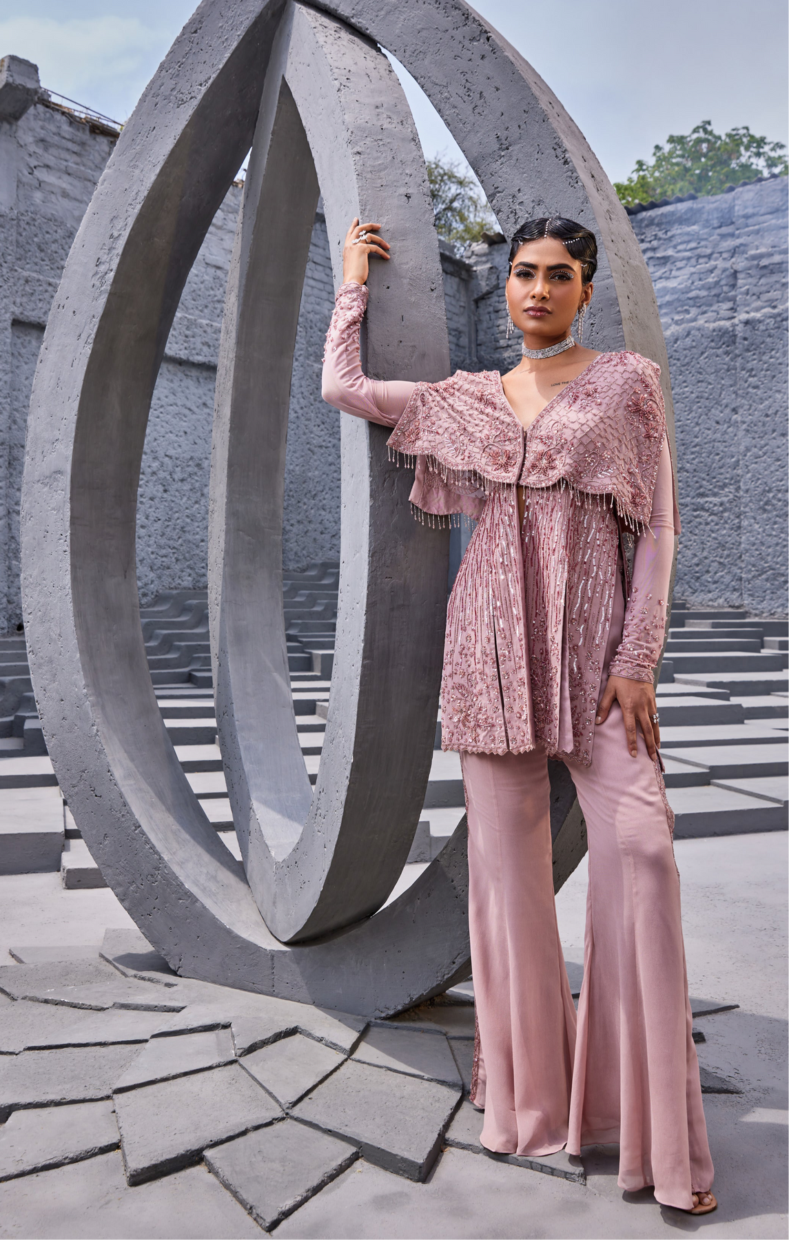 • Combination of the jacket, overjacket, and palazzo pants creates a unique ensemble