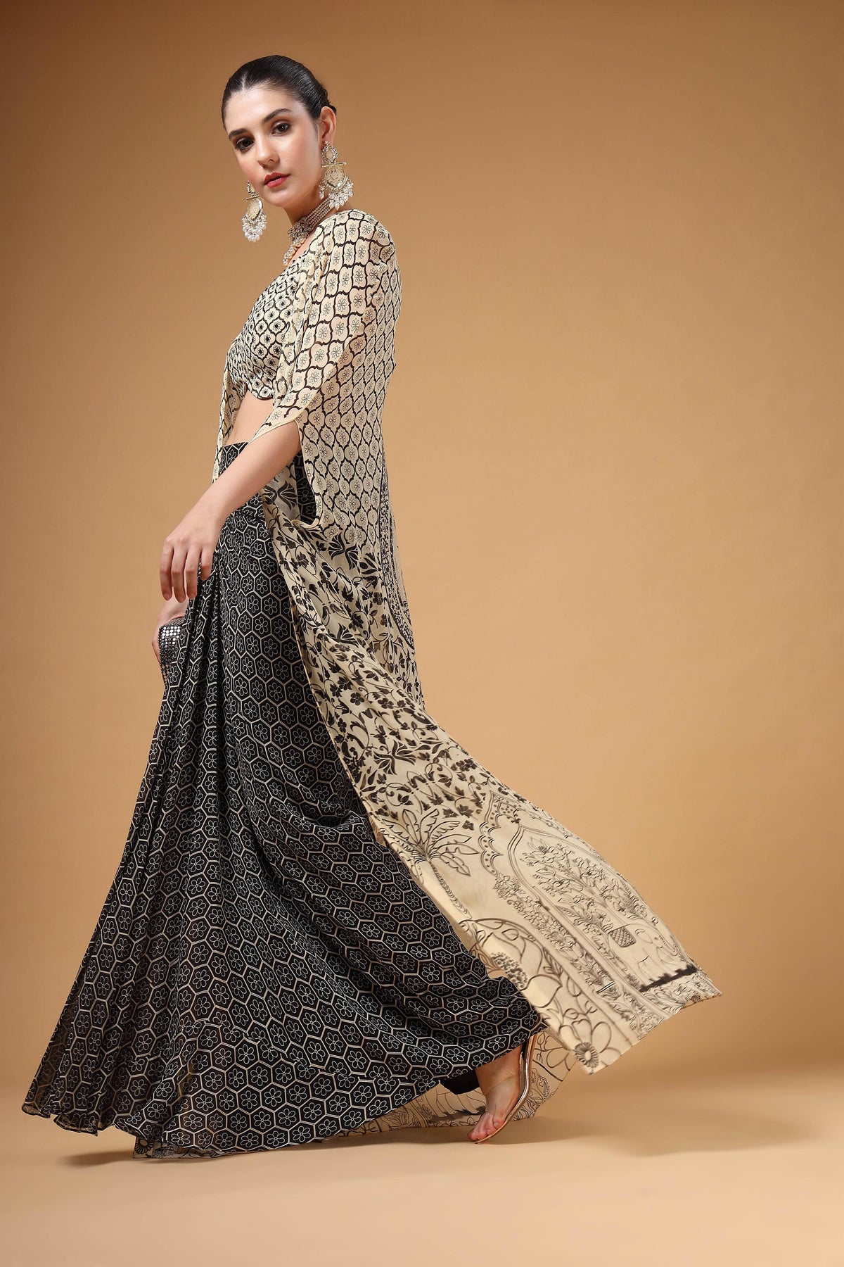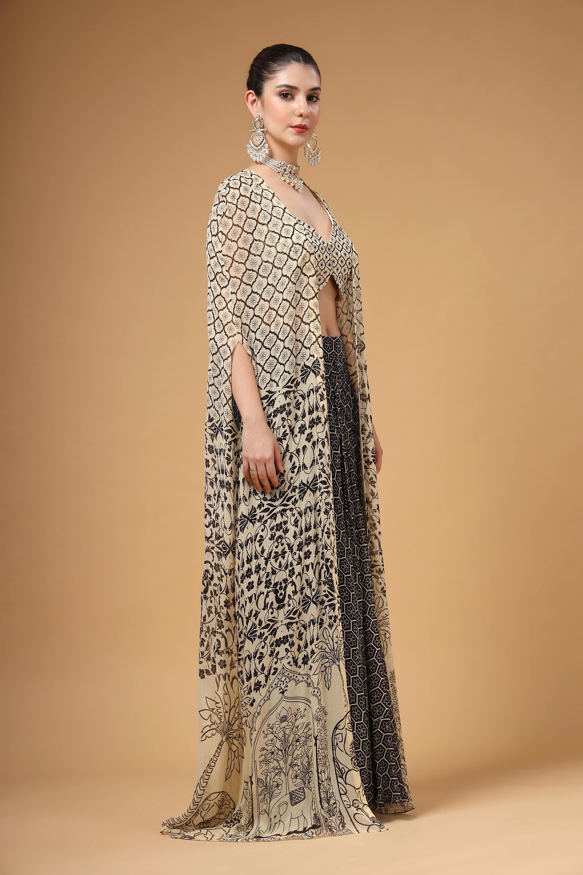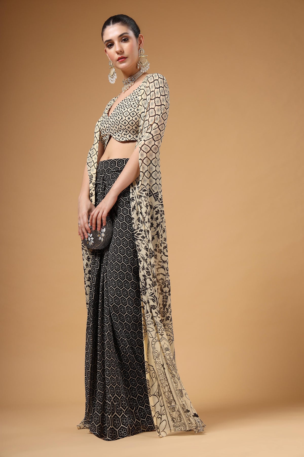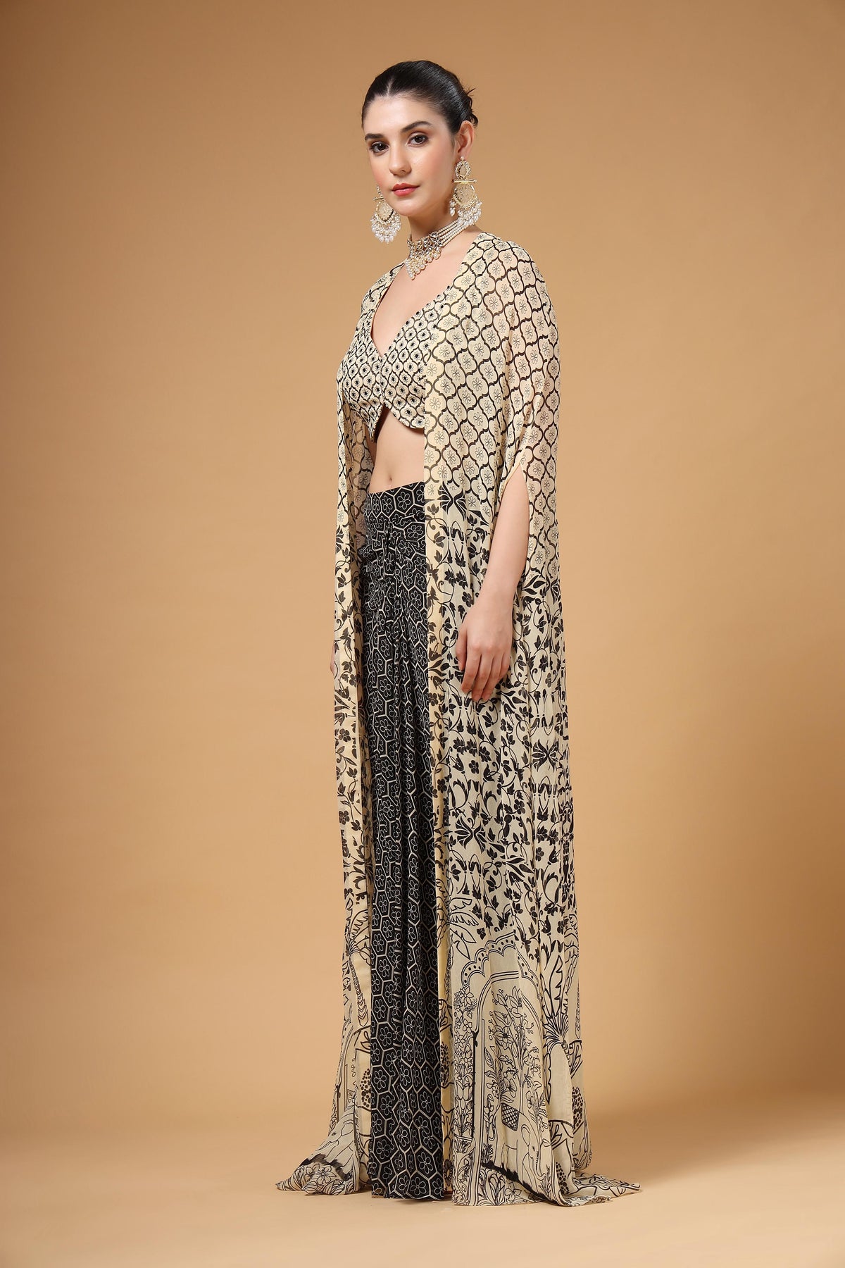 A beautiful printed cape set featuring a blouse with sequin embroidery paired with a draped skirt. Lightweight, comfortable, and easy to carry, this ensemble perfectly balances glamour with effortless elegance.