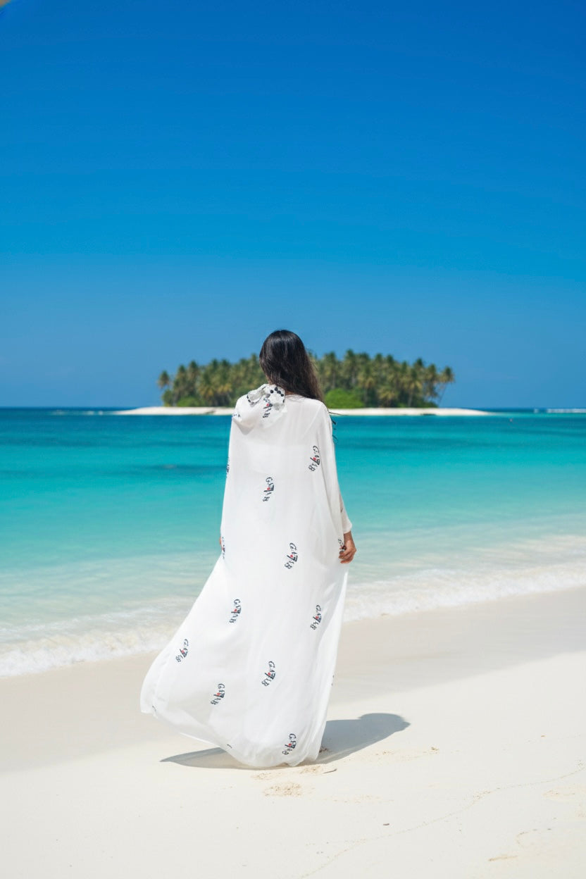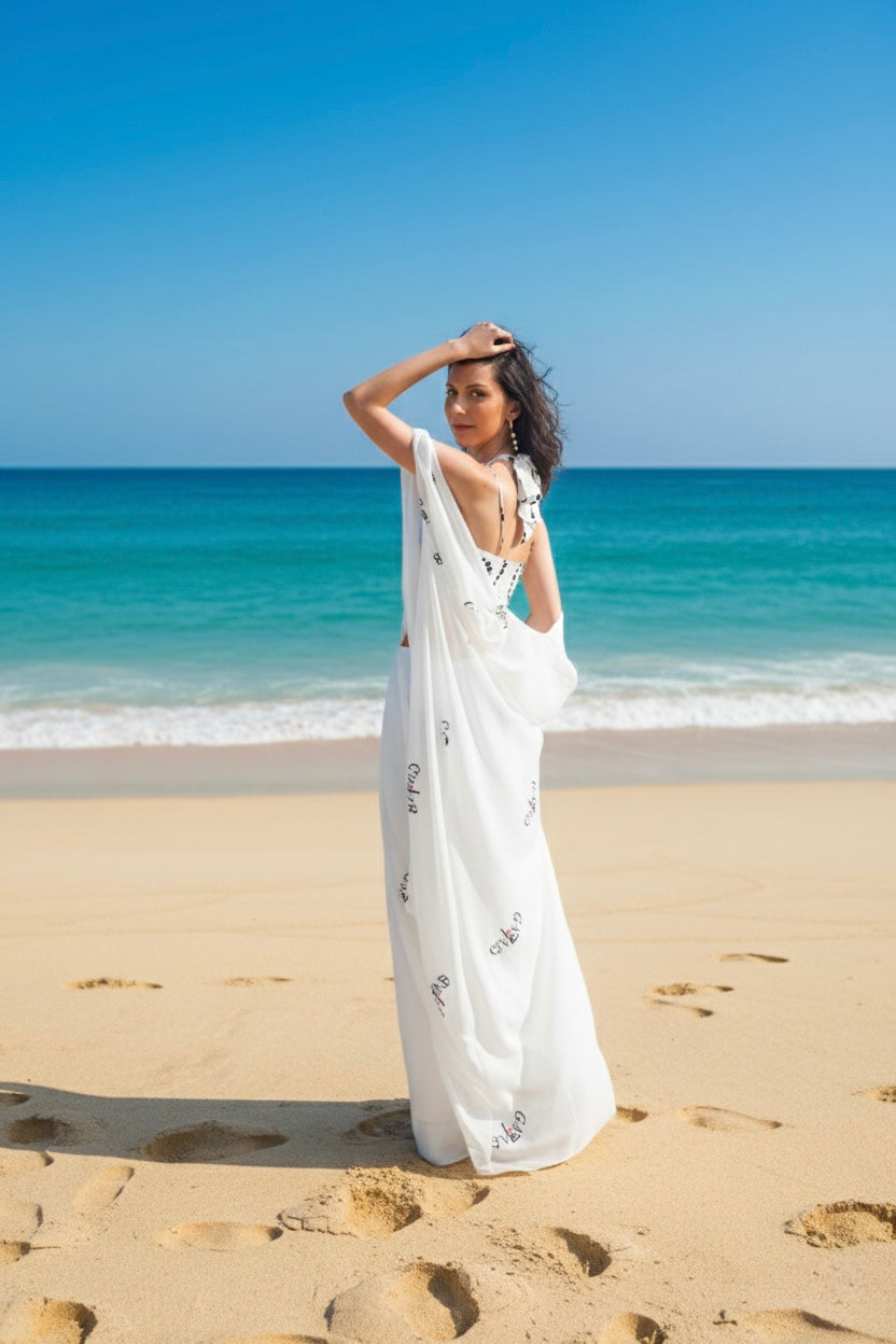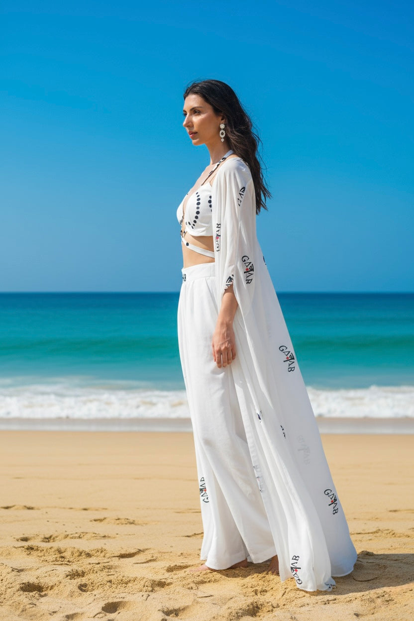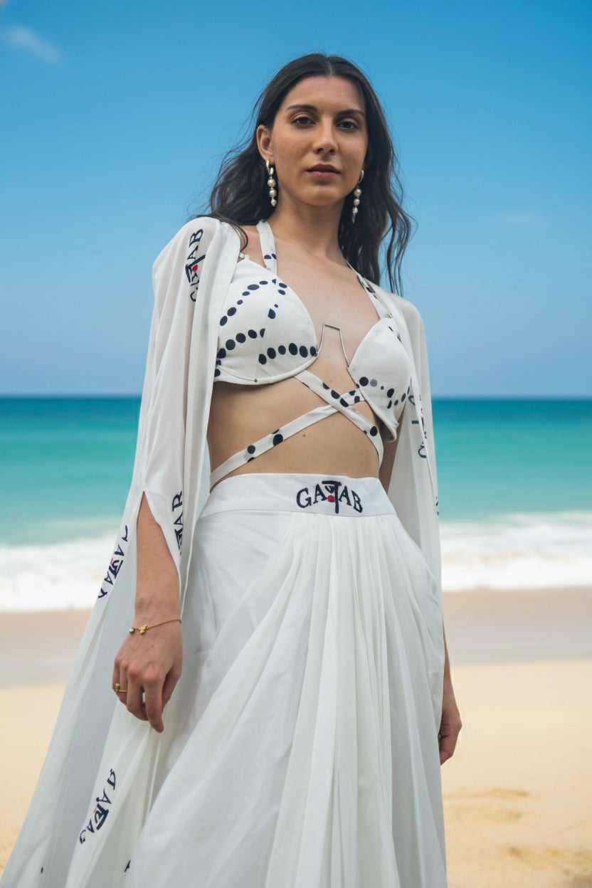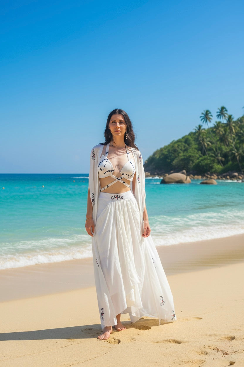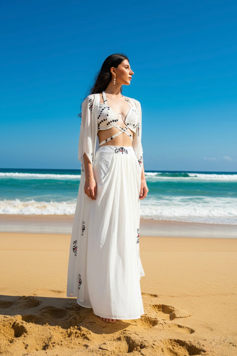 A structured blouse paired with a draped skirt and a complementing cape. The blouse features a string tie-up around the neck and an adjustable waist string to enhance the silhouette, adding a chic and contemporary touch. The skirt is adorned with bold and beautiful sequin embroidery on the waistband, creating a striking focal point. Crafted in a lightweight fabric, this ensemble is perfect for summer wear - stylish, comfortable and easy to carry.