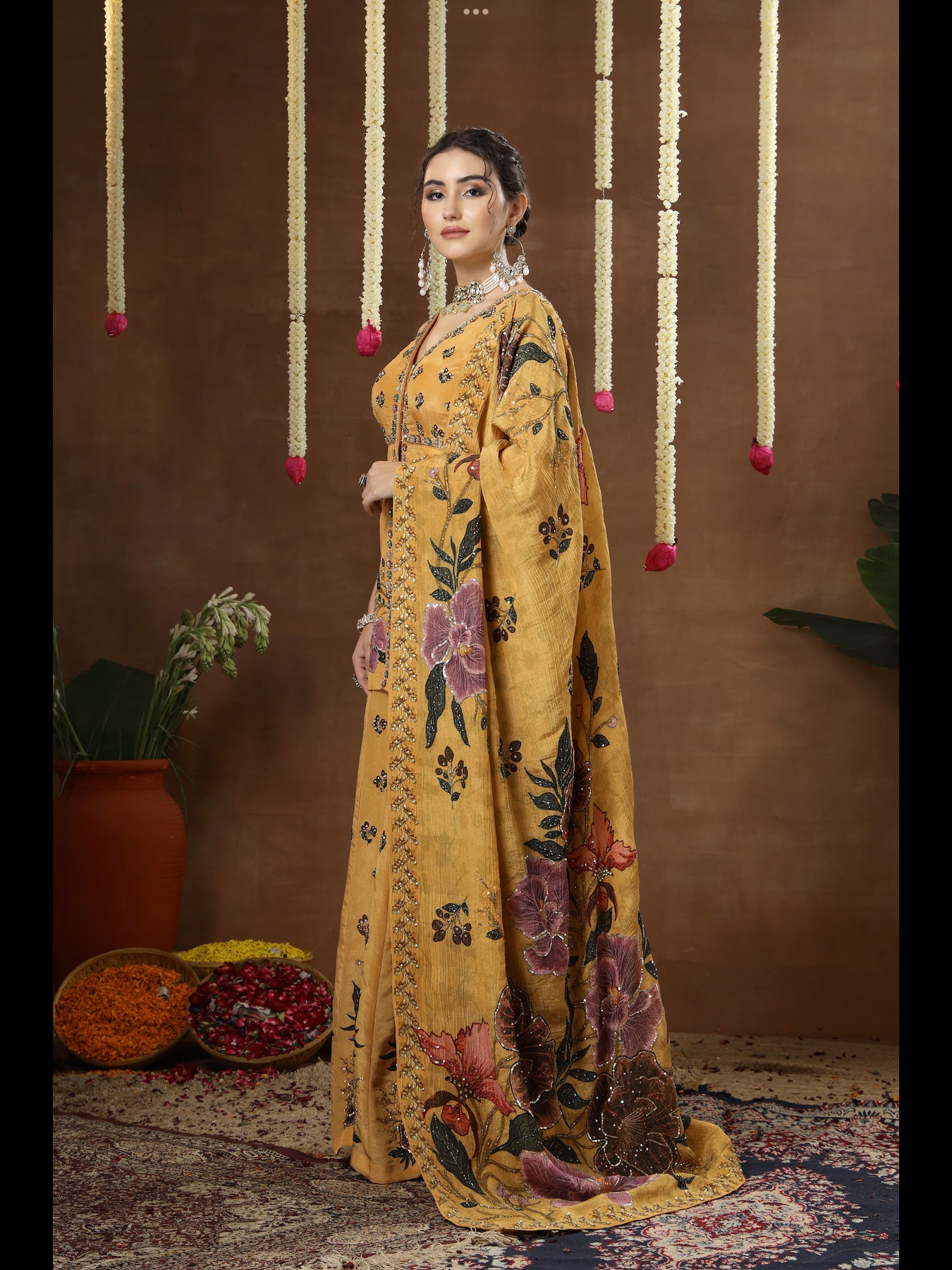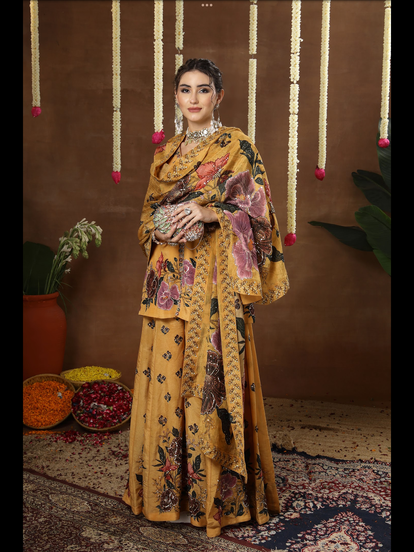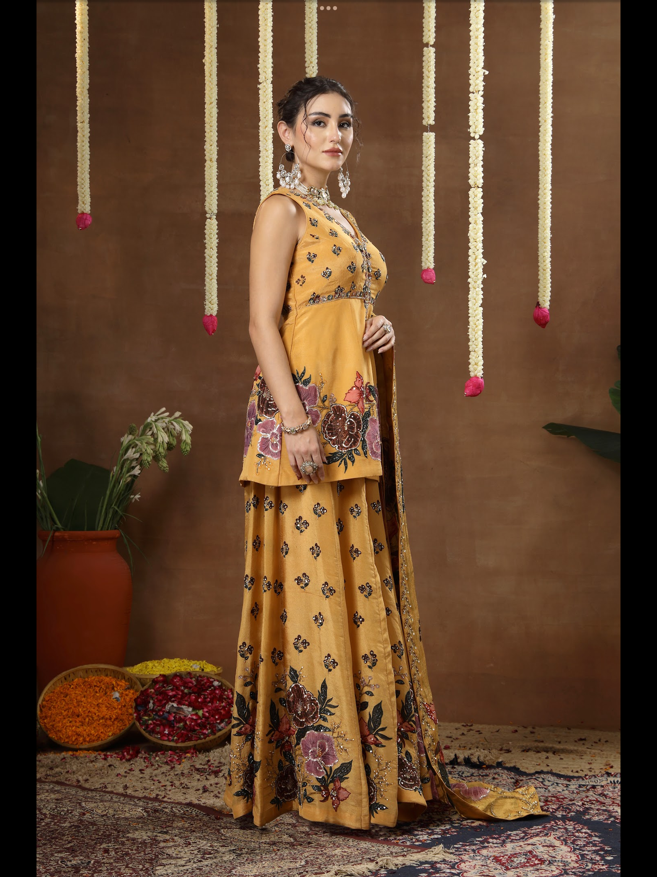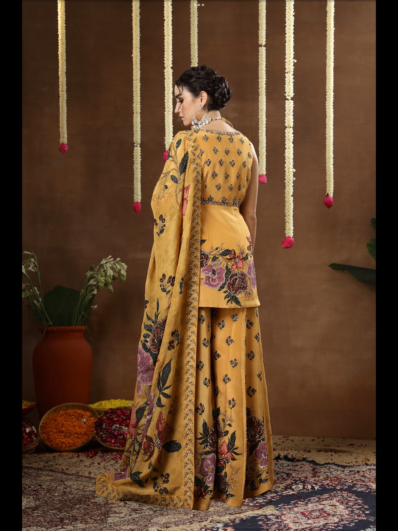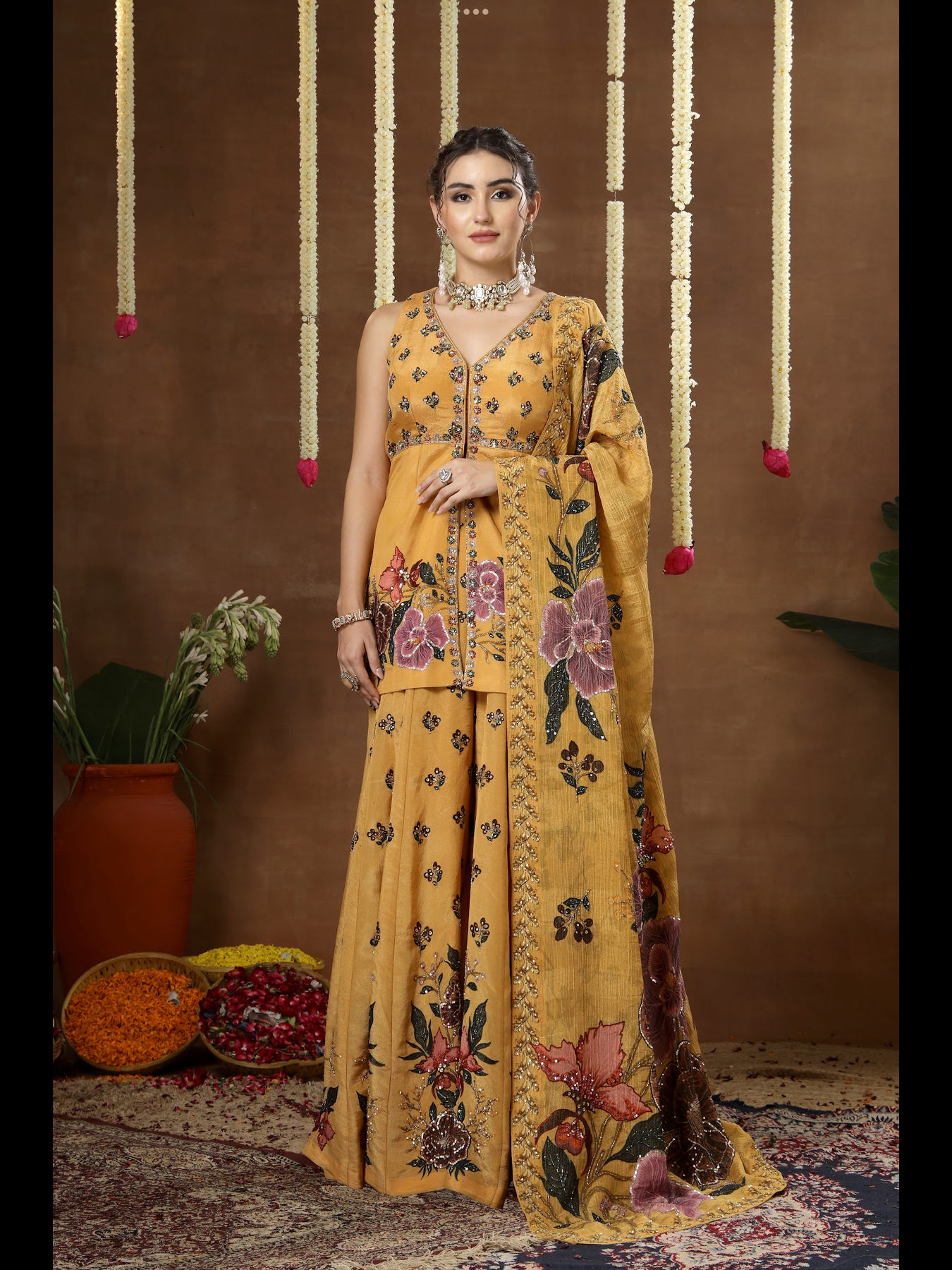 The ensemble showcases a chic peplum top styled with a gracefully flared sharara and a soft, flowing dupatta. Designed on a beautifully printed base, the outfit is further enriched with intricate embroidery that highlights the motifs and adds a luxurious handcrafted finish. The interplay of print and detailed embellishment gives the look a unique blend of vibrance, elegance, and modern sophistication.