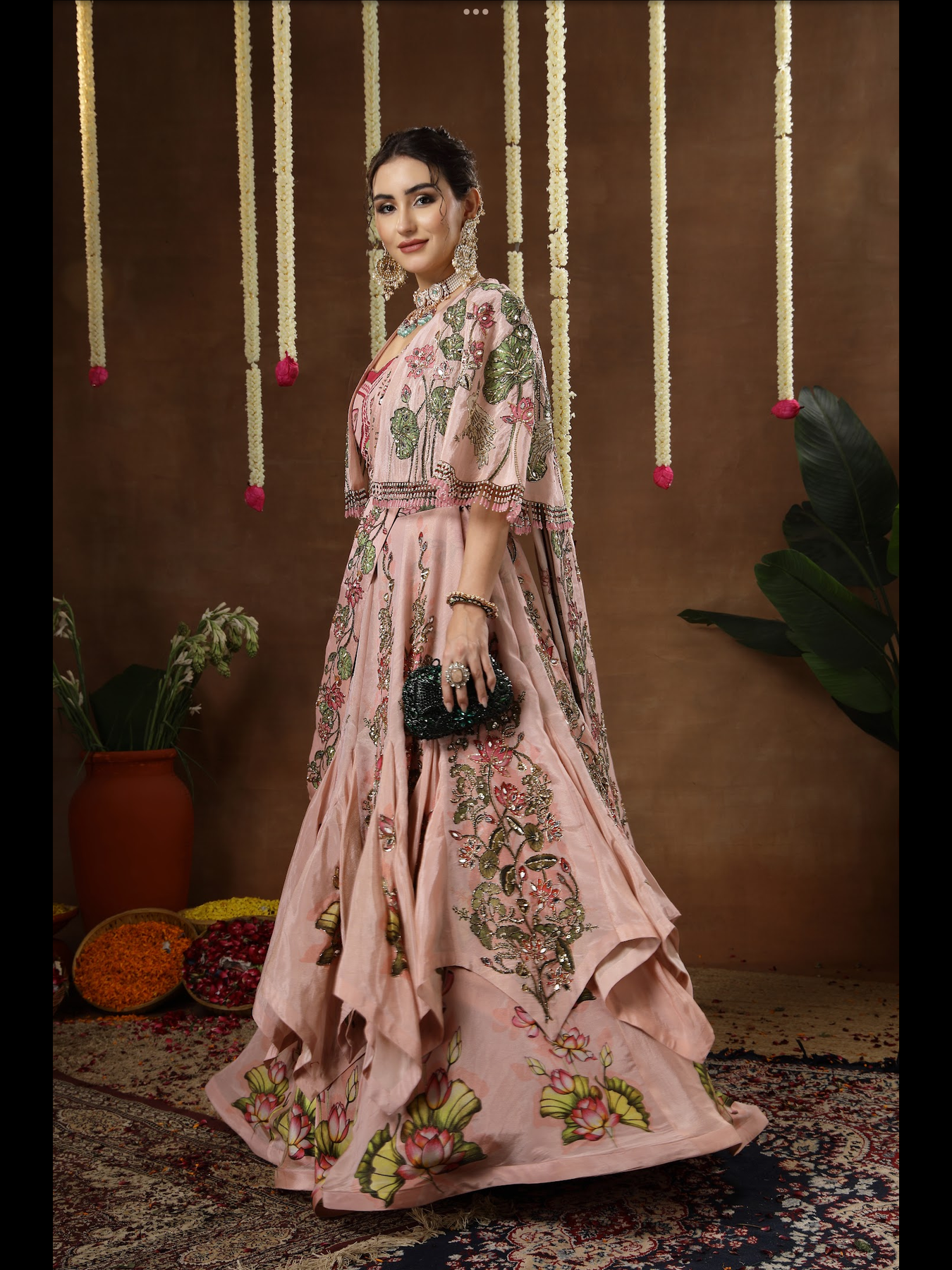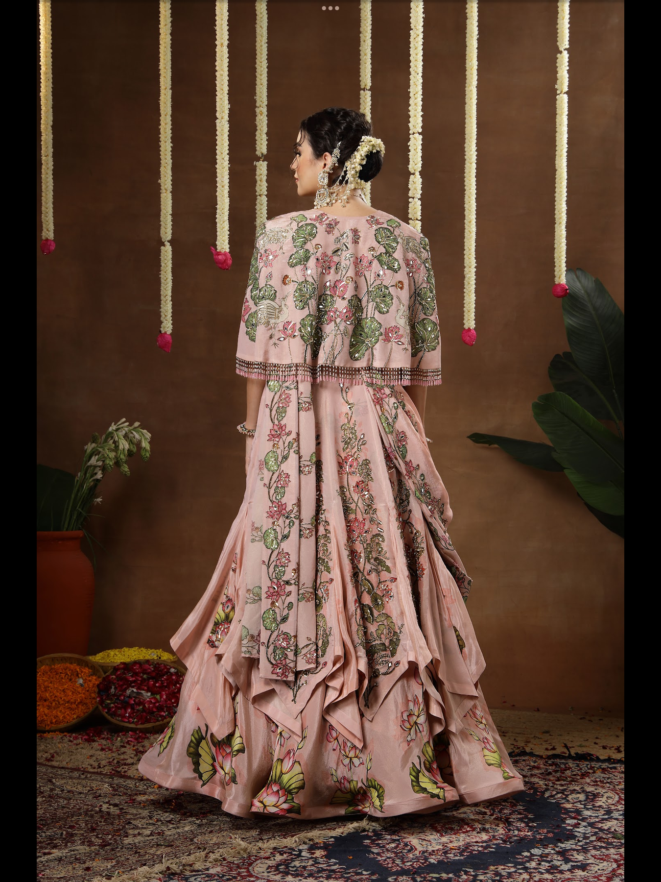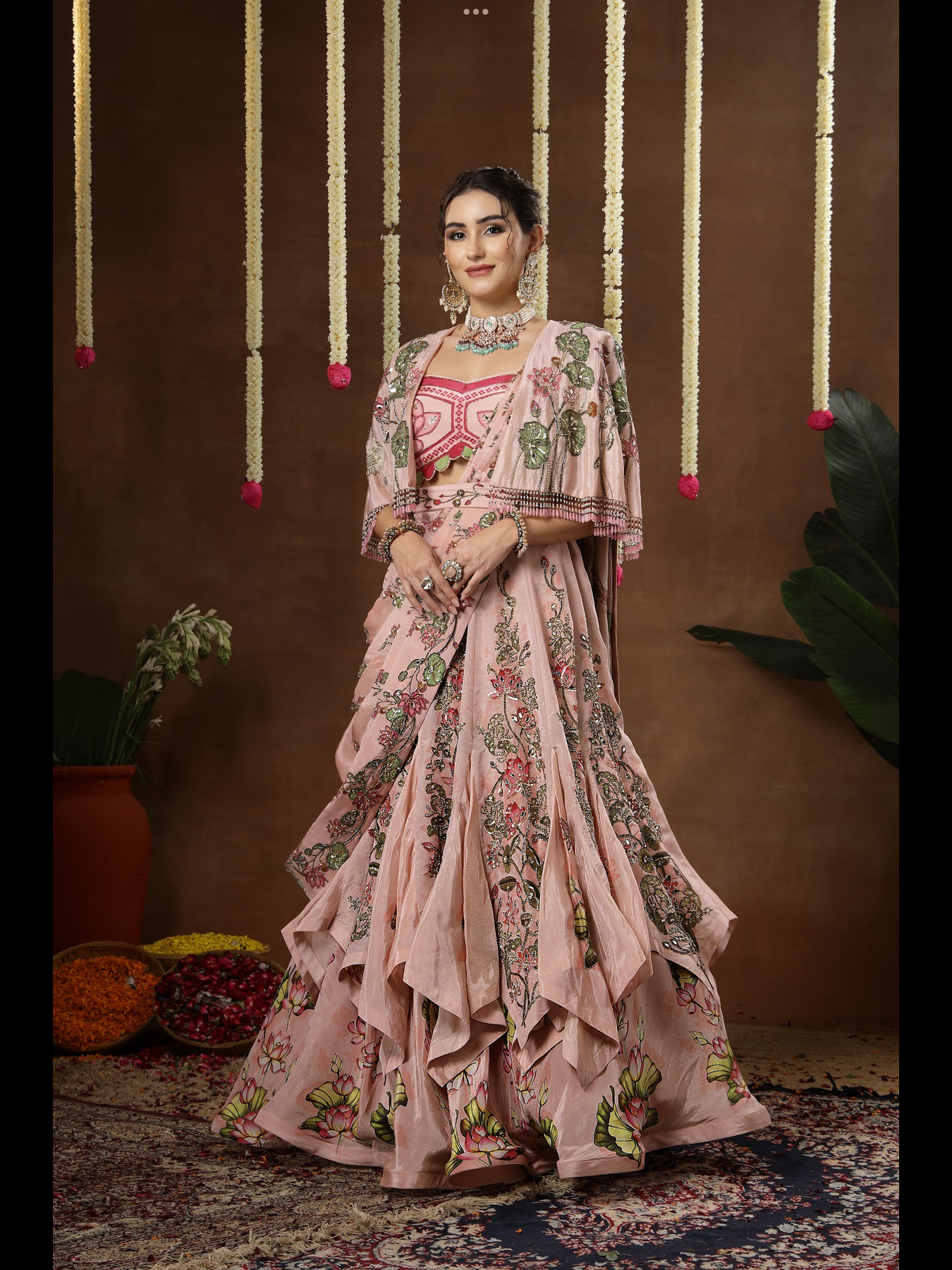 A double layered kalidaar lehenga paired with a blouse, cape and detachable palla. The entire outfit features intricately detailed hand embroidery. It comes with an embroidered belt that defines the waist and enhances the overall silhouette. The cape is finished with beautifully crafted, elegant latkans along the edges, adding a graceful touch to the ensemble.