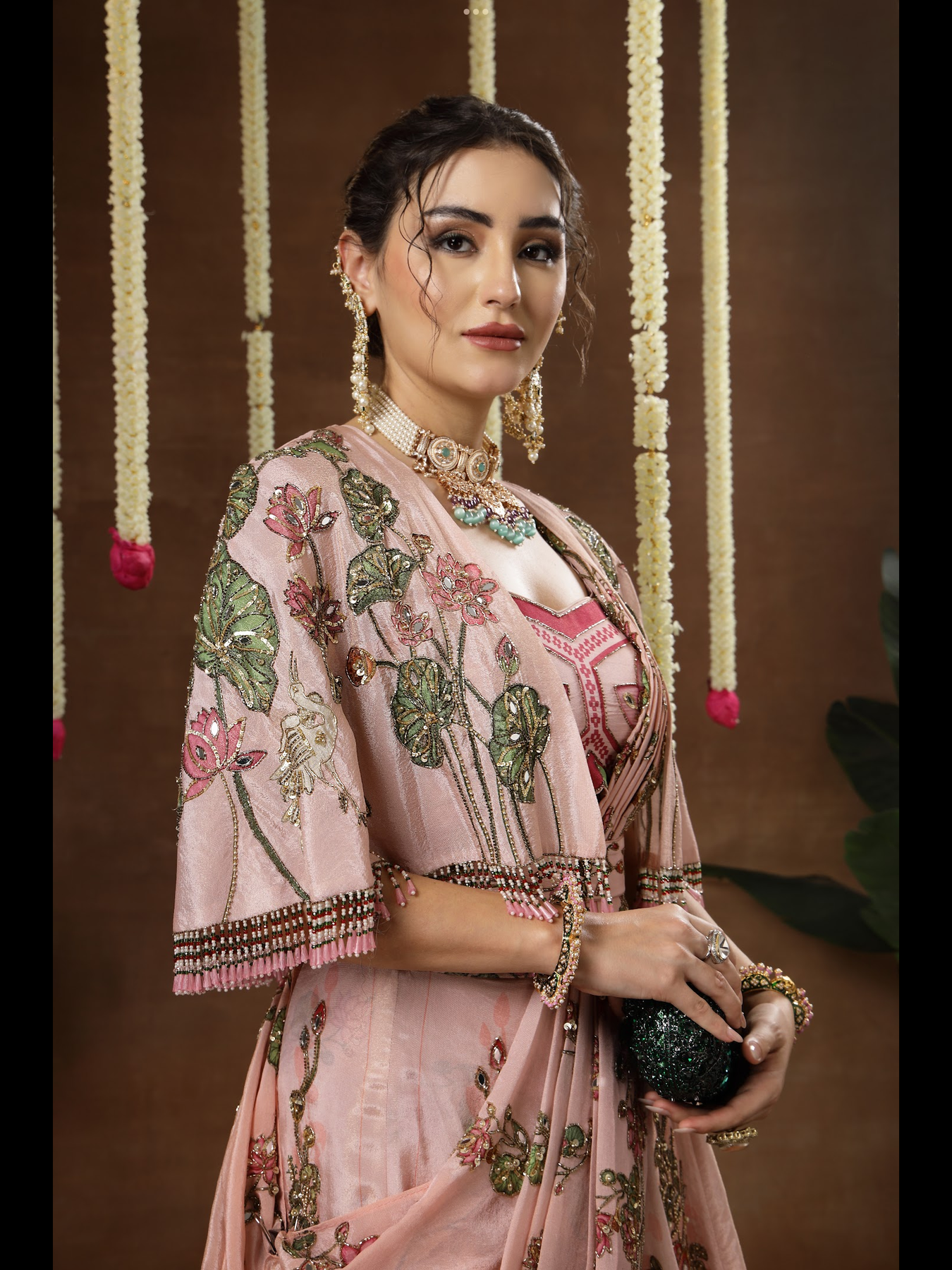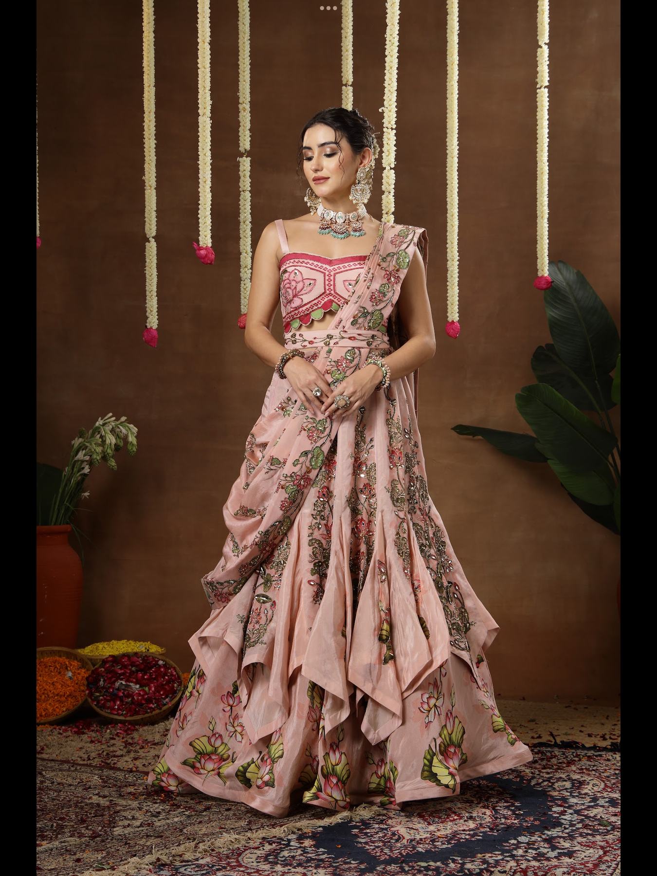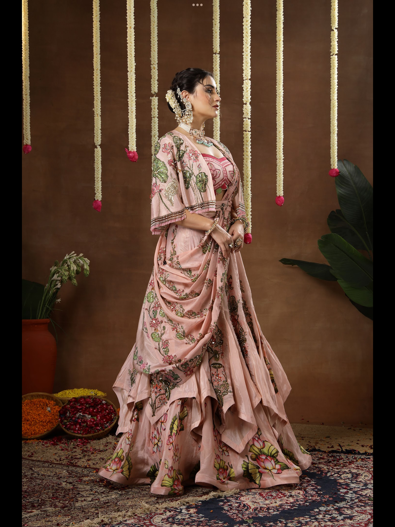 A double layered kalidaar lehenga paired with a blouse, cape and detachable palla. The entire outfit features intricately detailed hand embroidery. It comes with an embroidered belt that defines the waist and enhances the overall silhouette. The cape is finished with beautifully crafted, elegant latkans along the edges, adding a graceful touch to the ensemble.