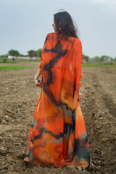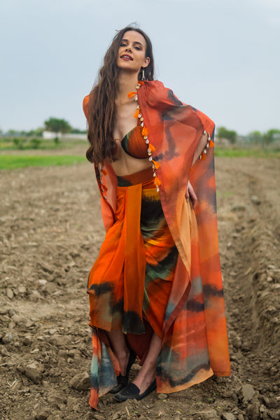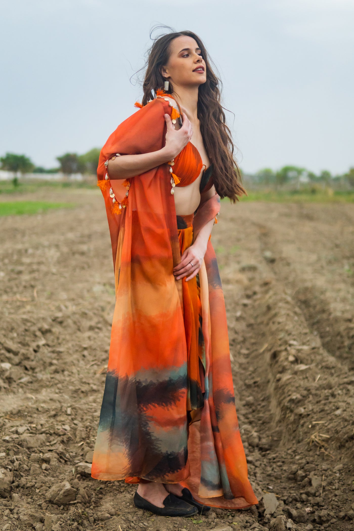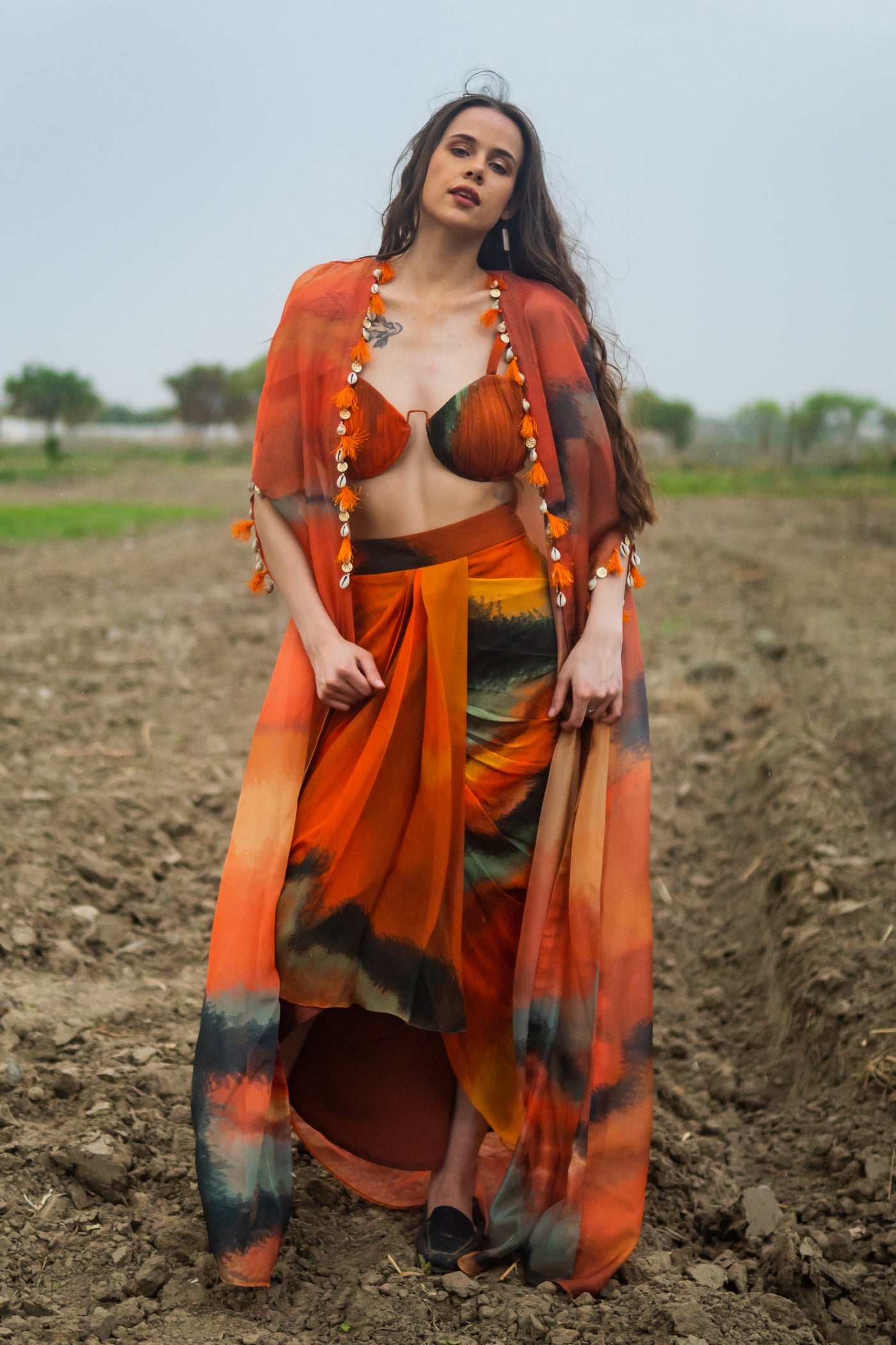 A beautiful orange cape paired with a corset blouse and drape skirt, featuring intricate detailing like shells, coins, and tassels along the hem—exudes a captivating blend of traditional and contemporary aesthetics