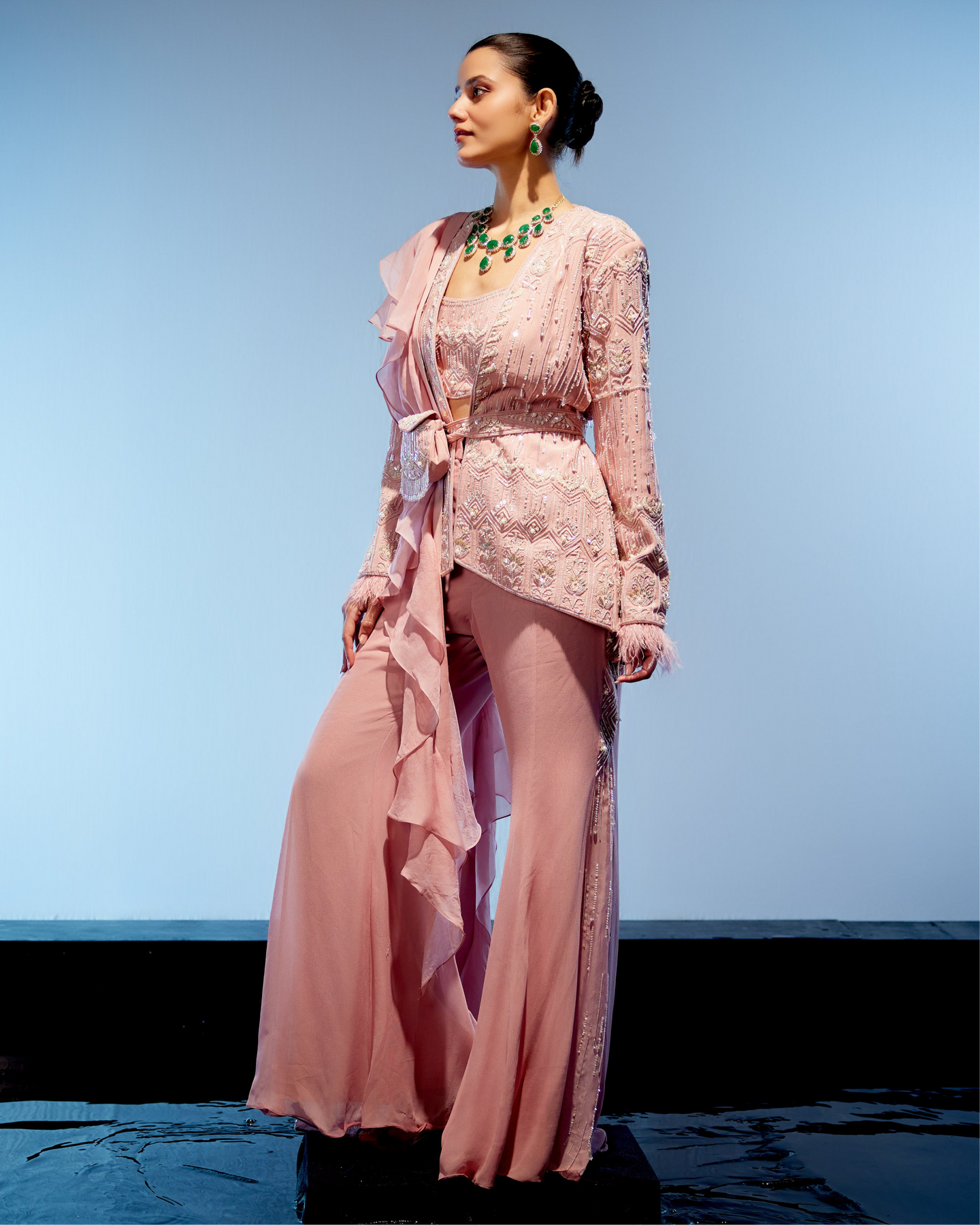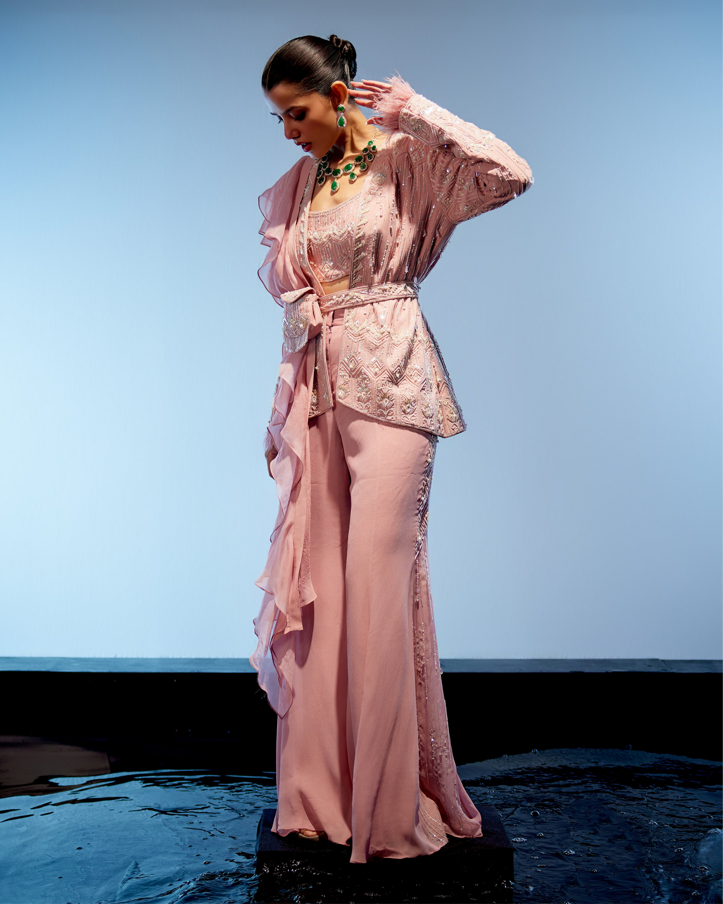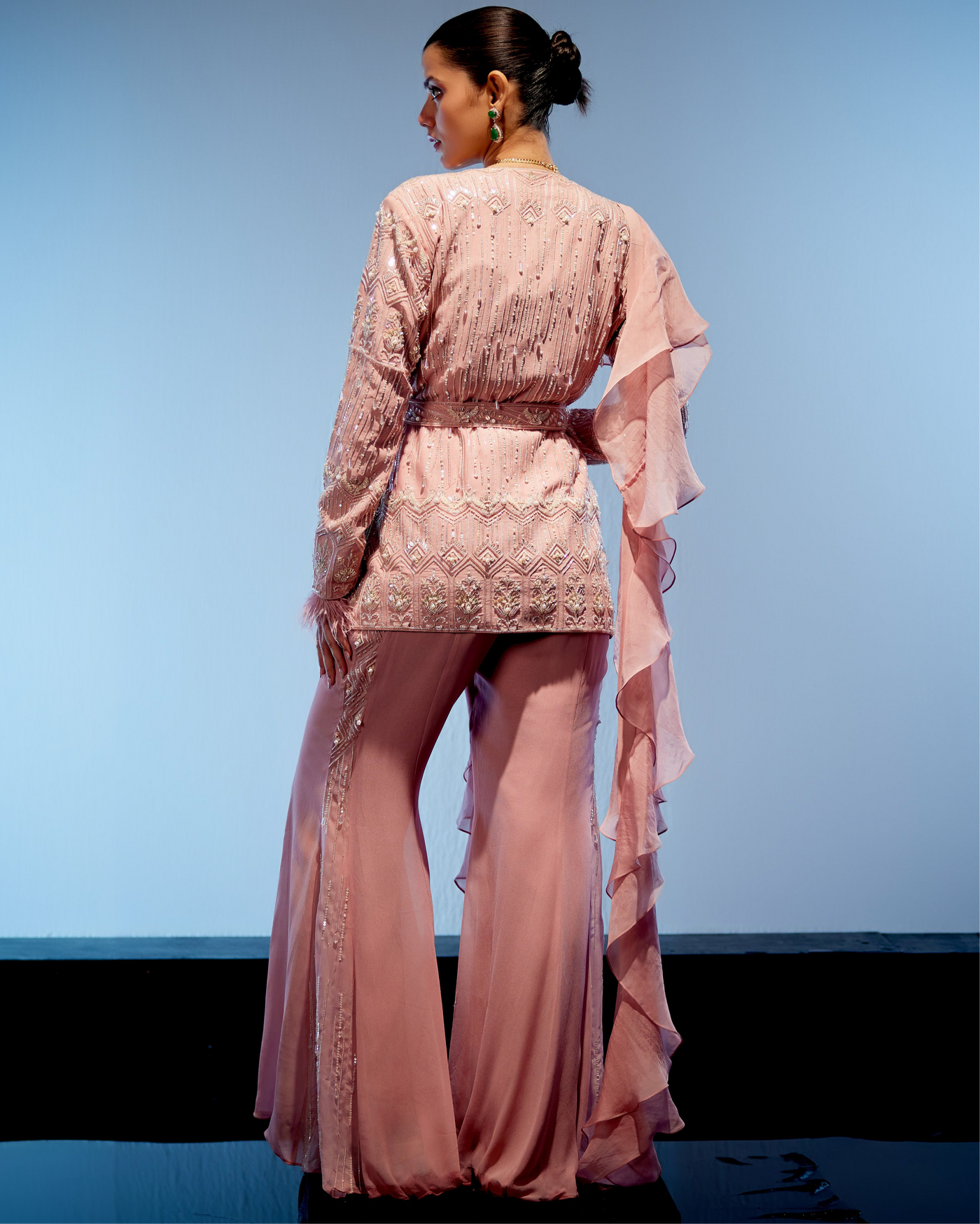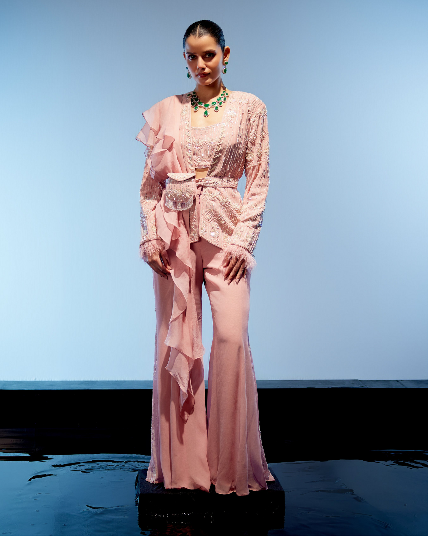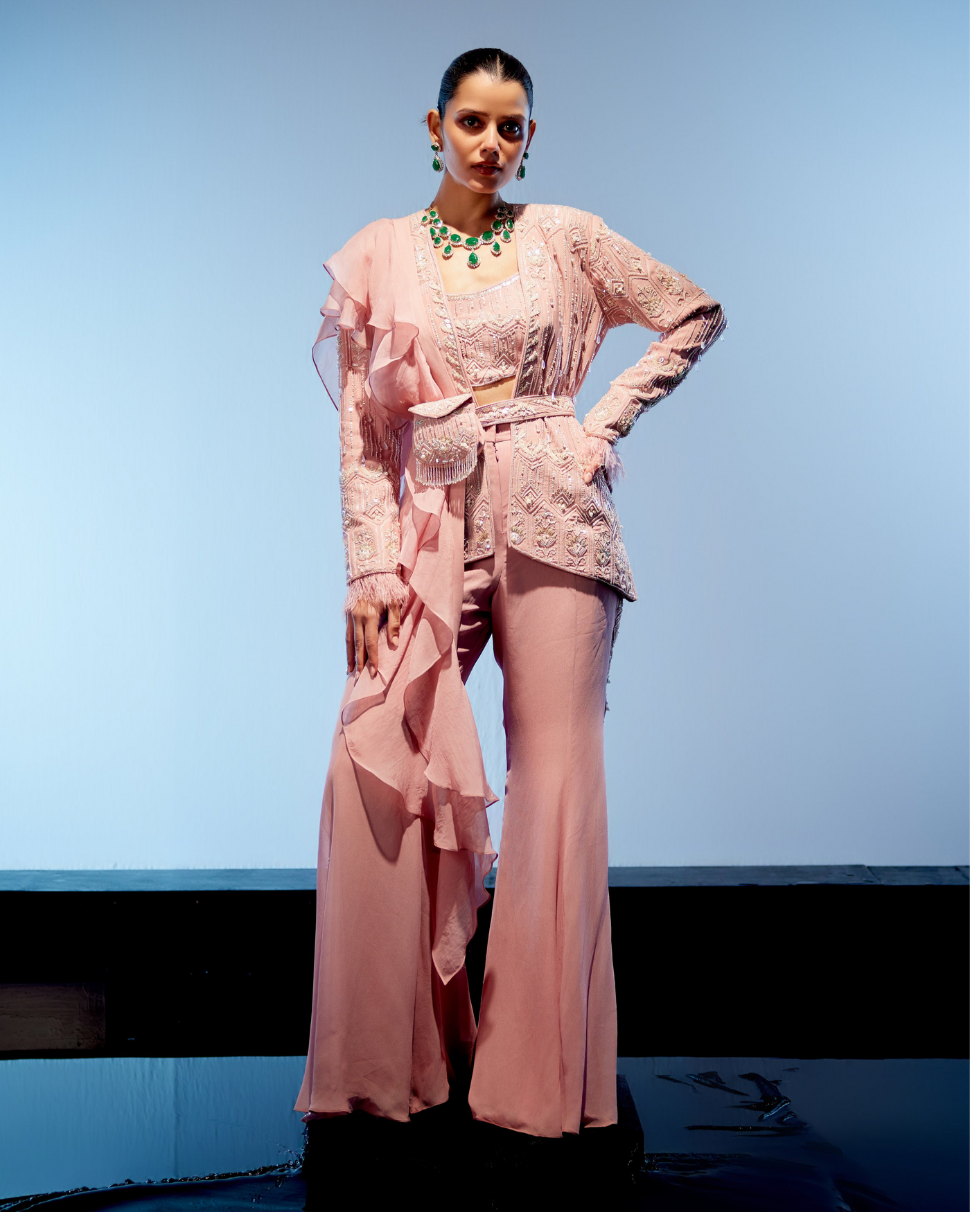 Stunning blush pink flared pant set adorned with jewel-toned embroidery along the sides, paired with a fitted bustier and a statement jacket featuring feather accents at the sleeve ends. The ensemble is accessorized with a ruffle dupatta and a belt pouch, enhancing the overall look of the garment.