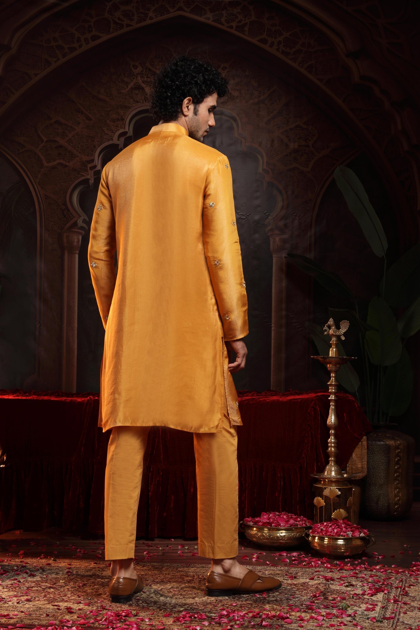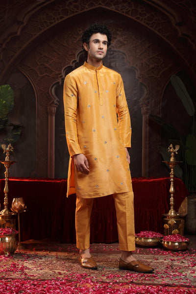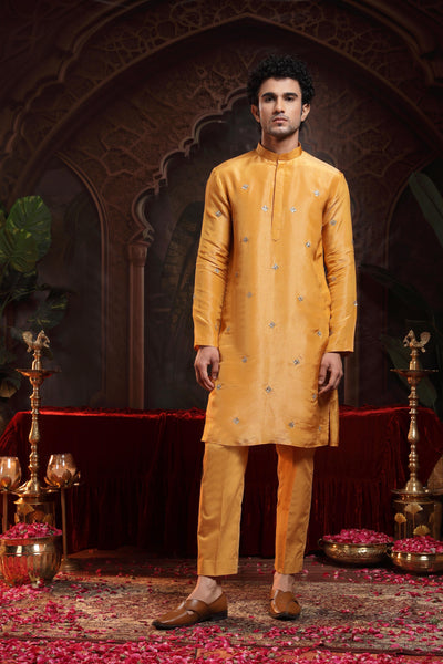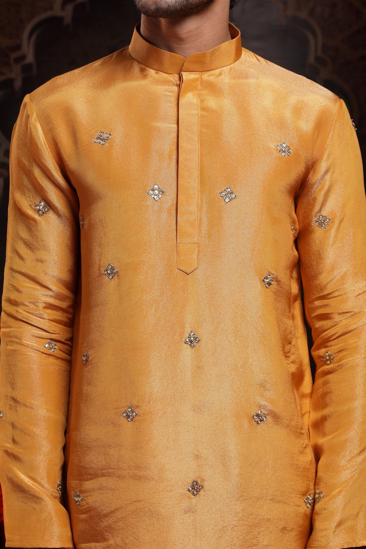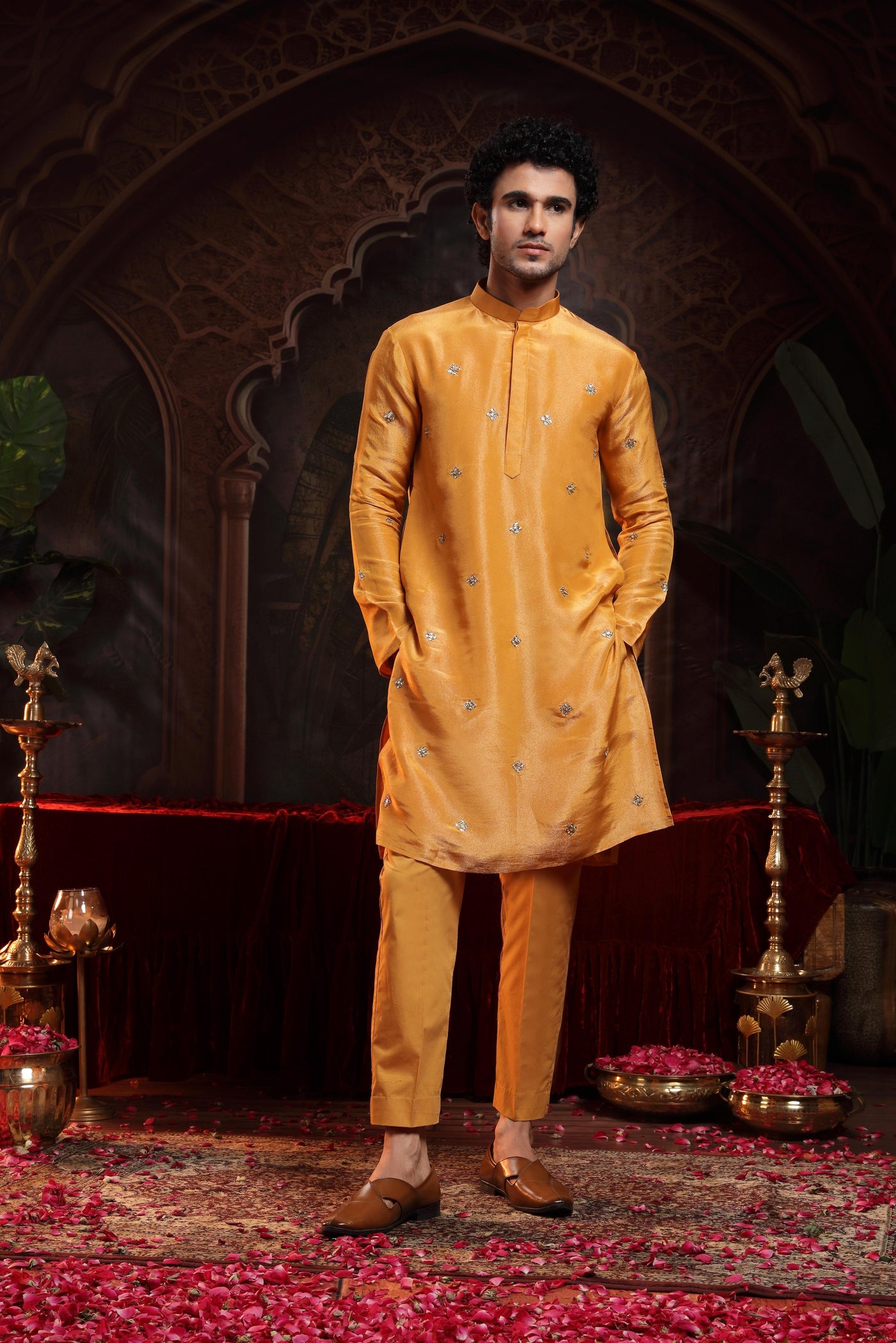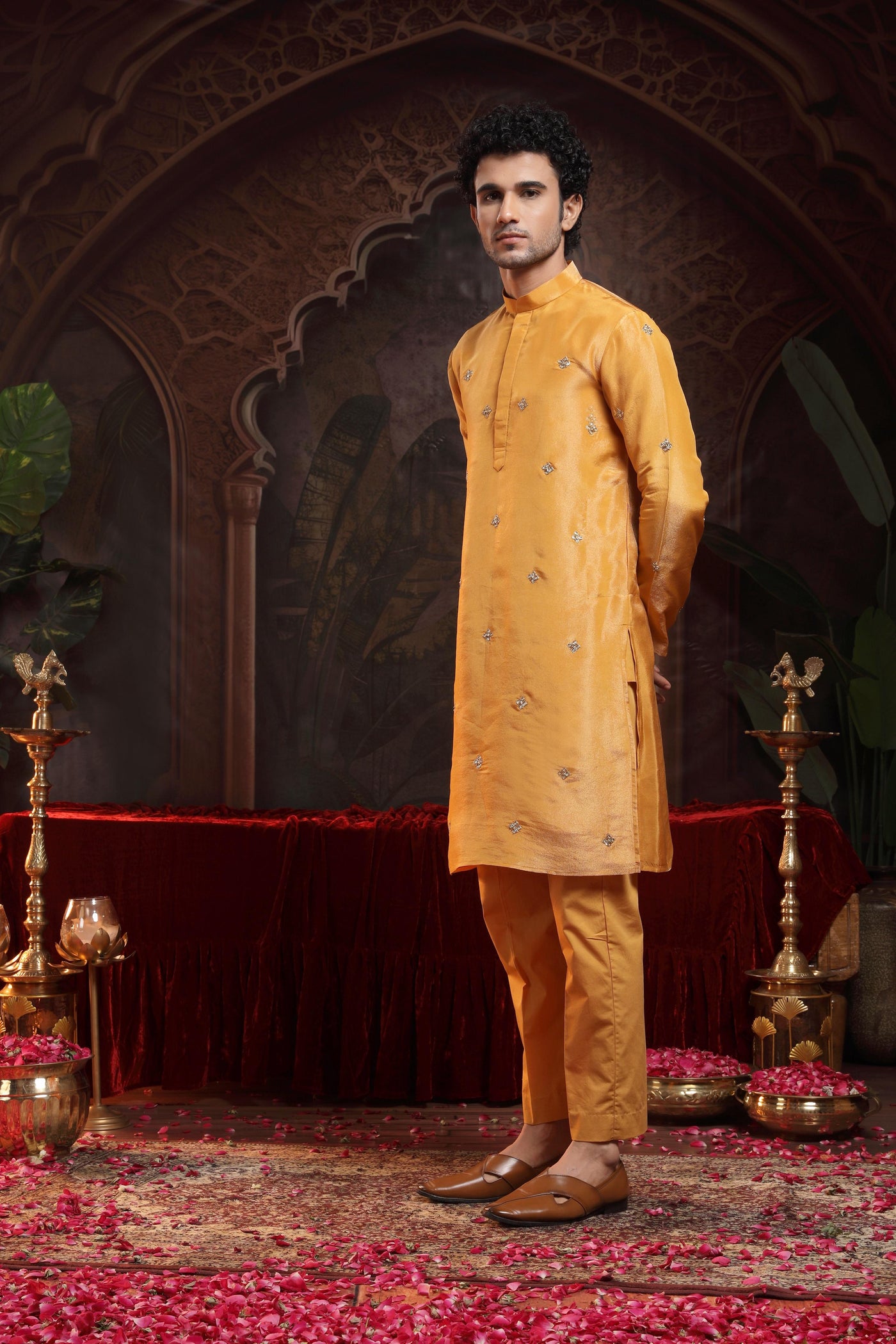 Radiating warmth and elegance, this yellow tissue straight kurta is a perfect blend of traditional charm and modern style. The kurta is adorned with all-over booties, adding intricate detail and texture to the soft, flowing tissue fabric, creating an eye-catching, radiant look.