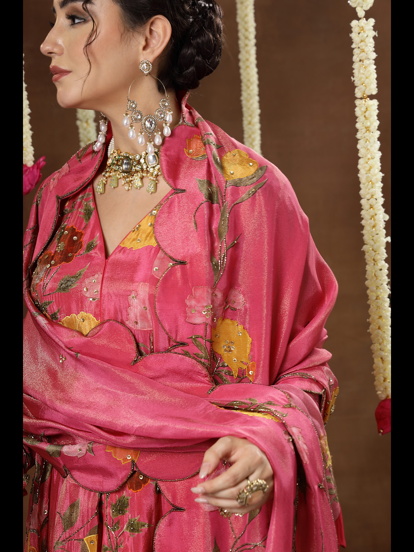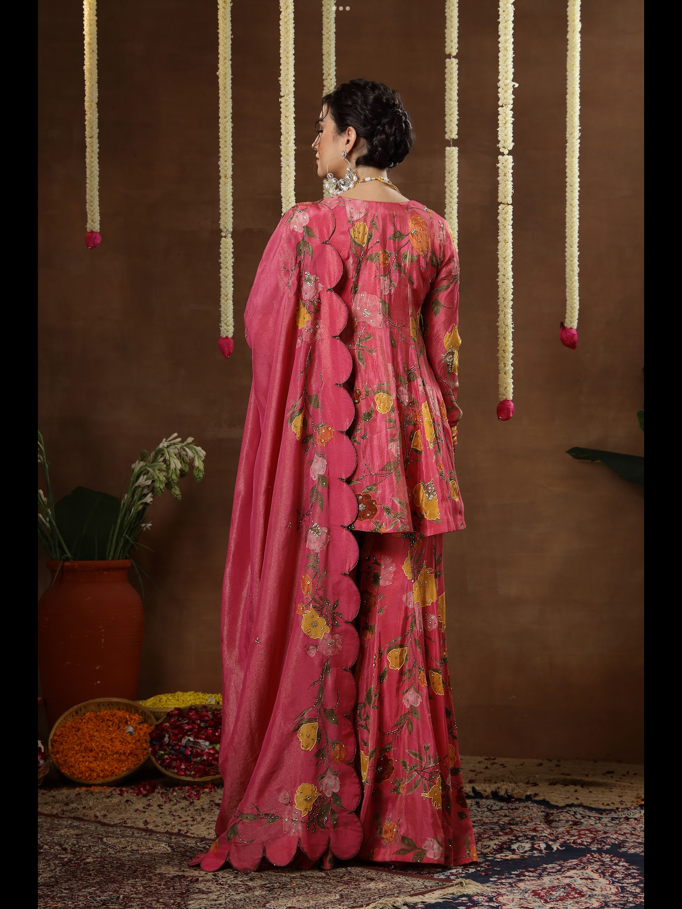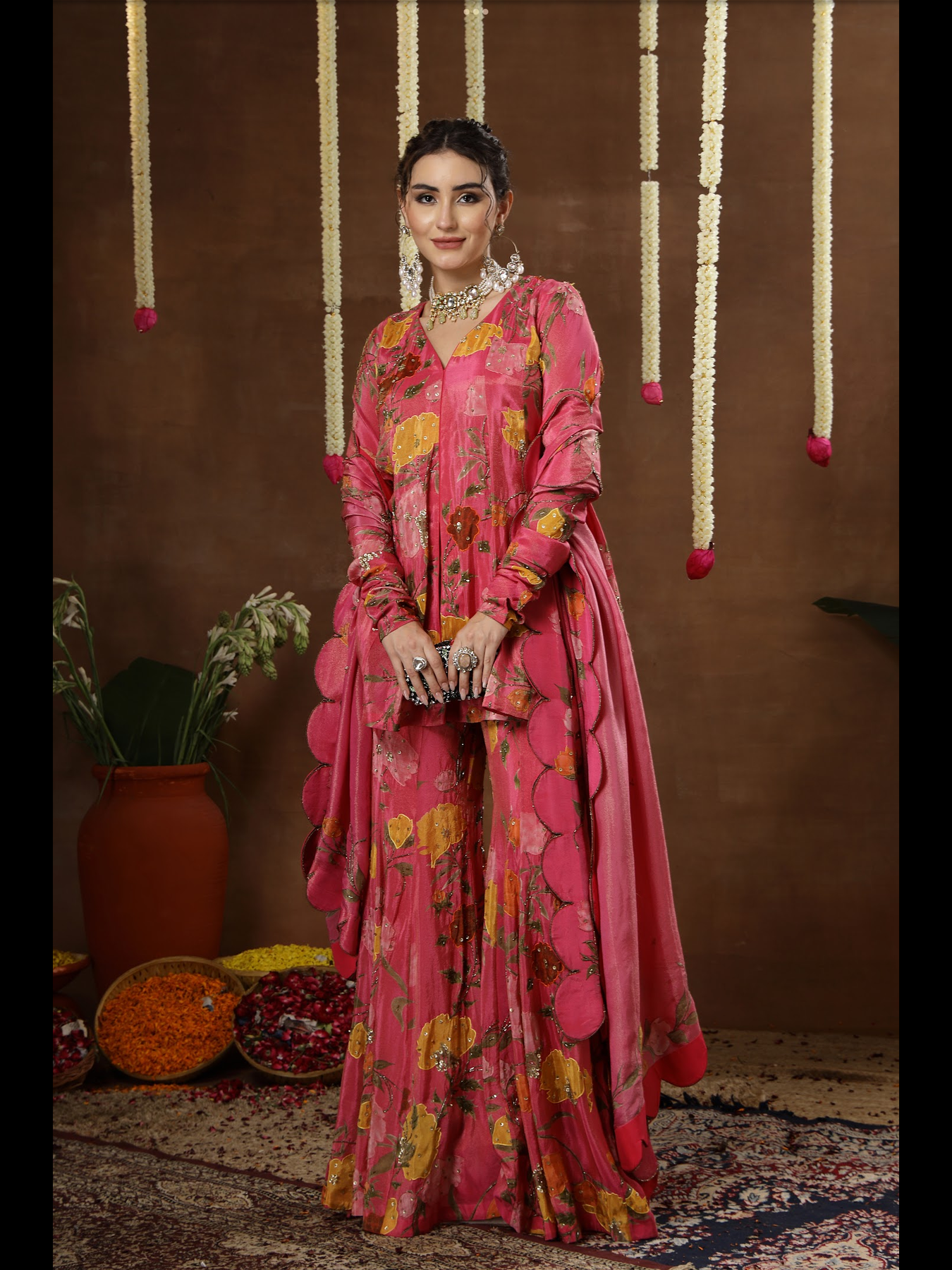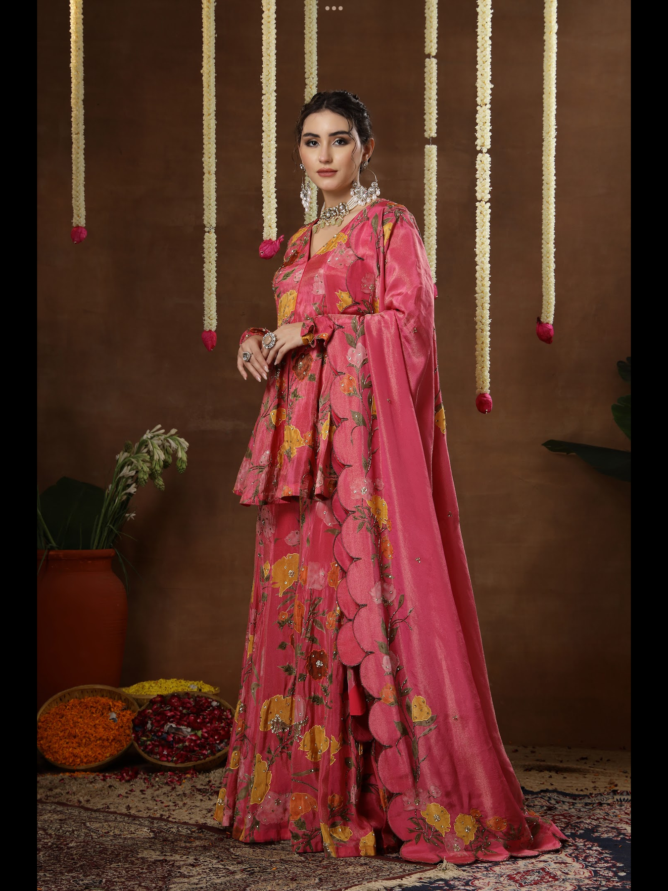 This ensemble features a beautifully crafted kalidaar peplum top paired with a wide-flared sharara and a soft, complementing dupatta. The outfit is designed on a rich printed base and further elevated with detailed embroidery that enhances every panel and motif. The kalidaar structure adds movement and grace, while the intricate handwork brings a refined, luxurious charm to the entire look.