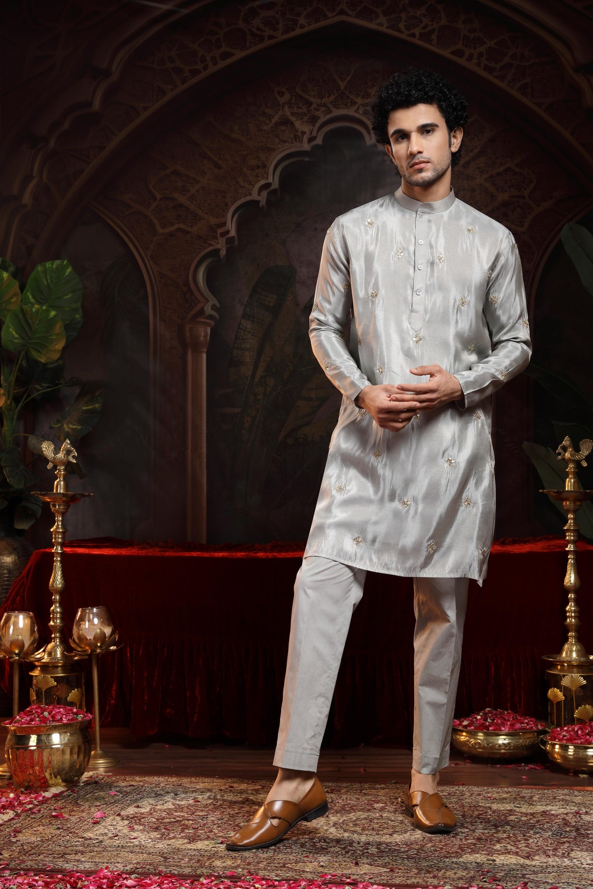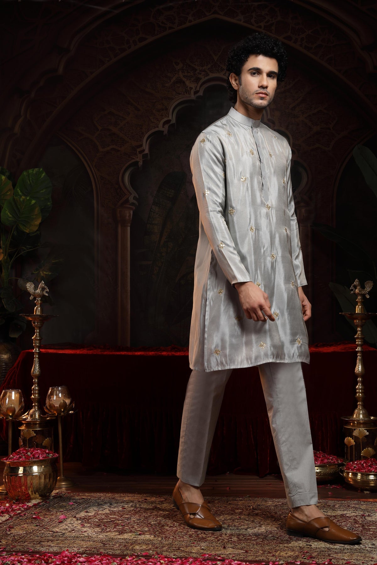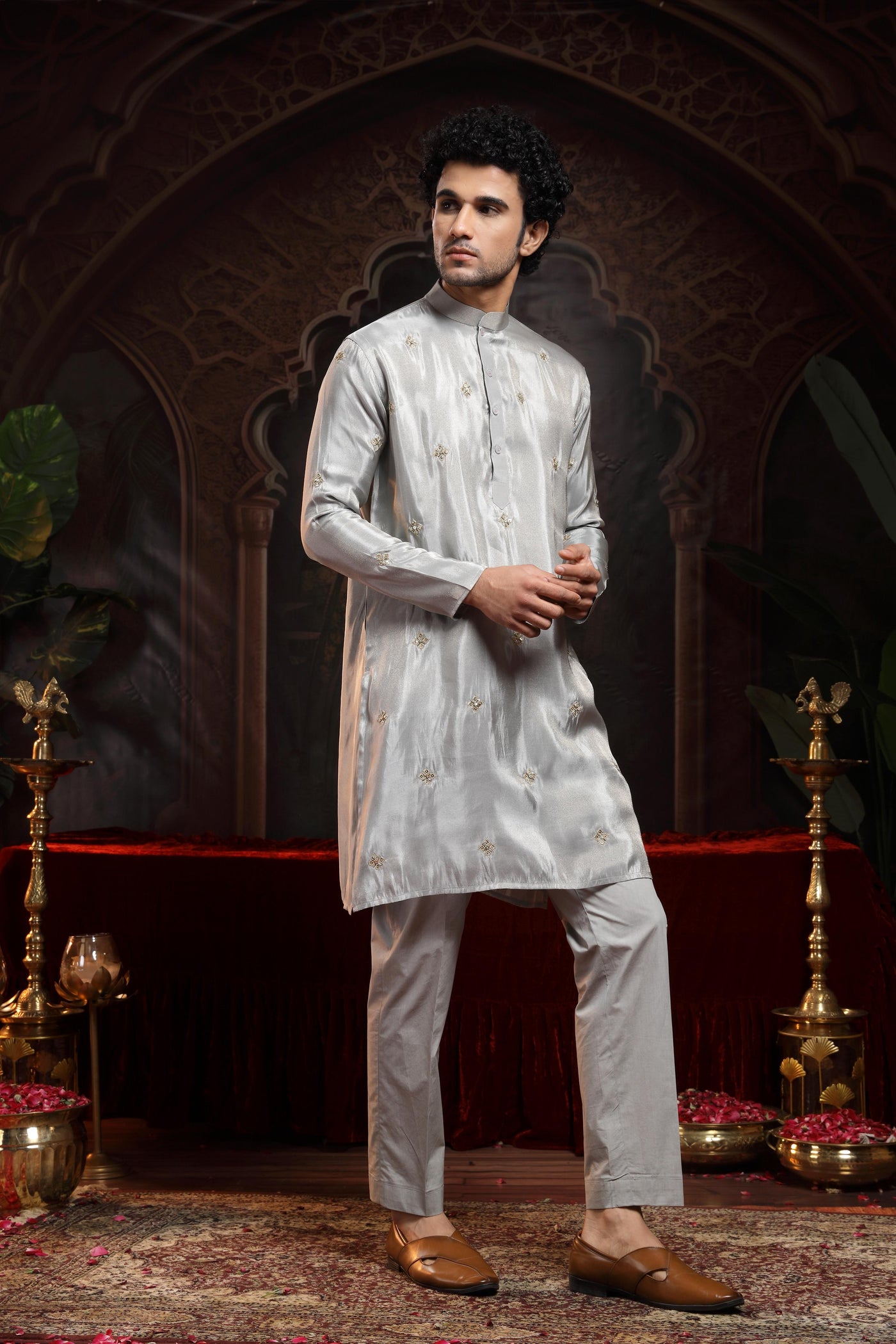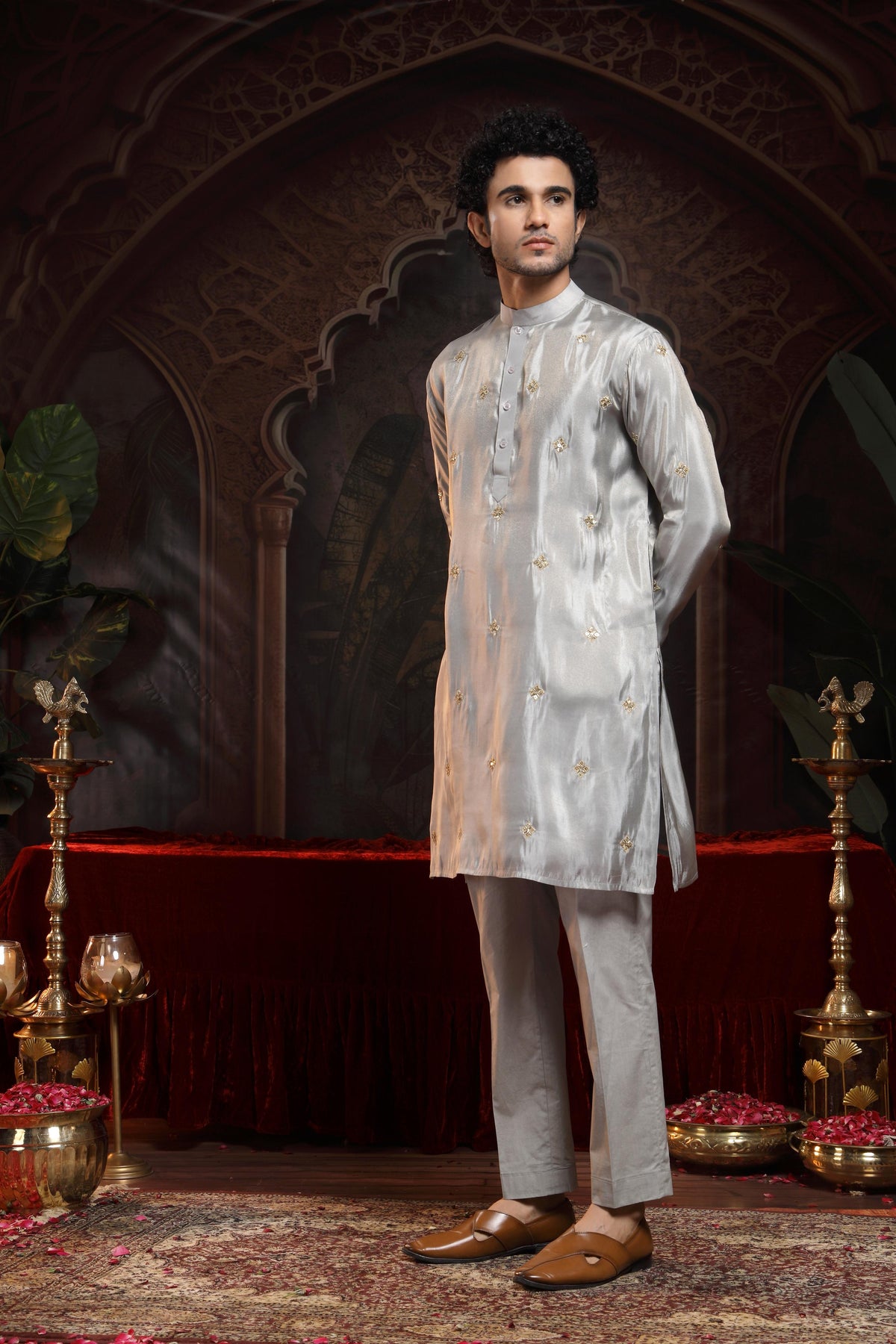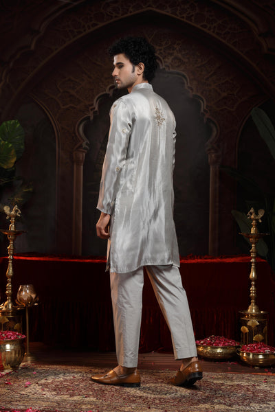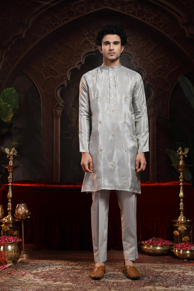 This refined tissue straight kurta is a perfect blend of subtle luxury and everyday elegance. Crafted from lightweight, sheer tissue fabric, the kurta features booties embroidered all over, including the pockets, adding a touch of intricate detailing throughout the silhouette.