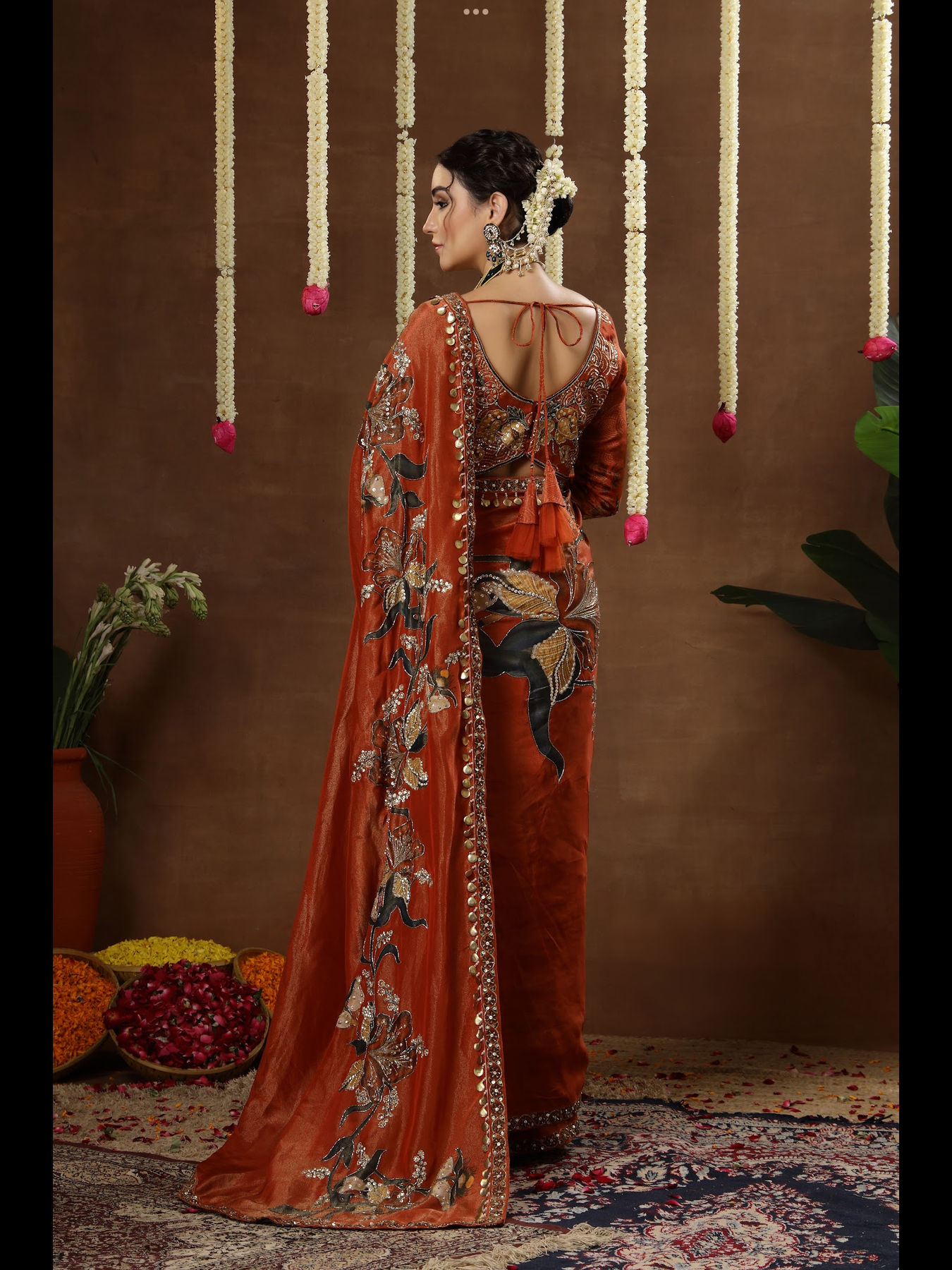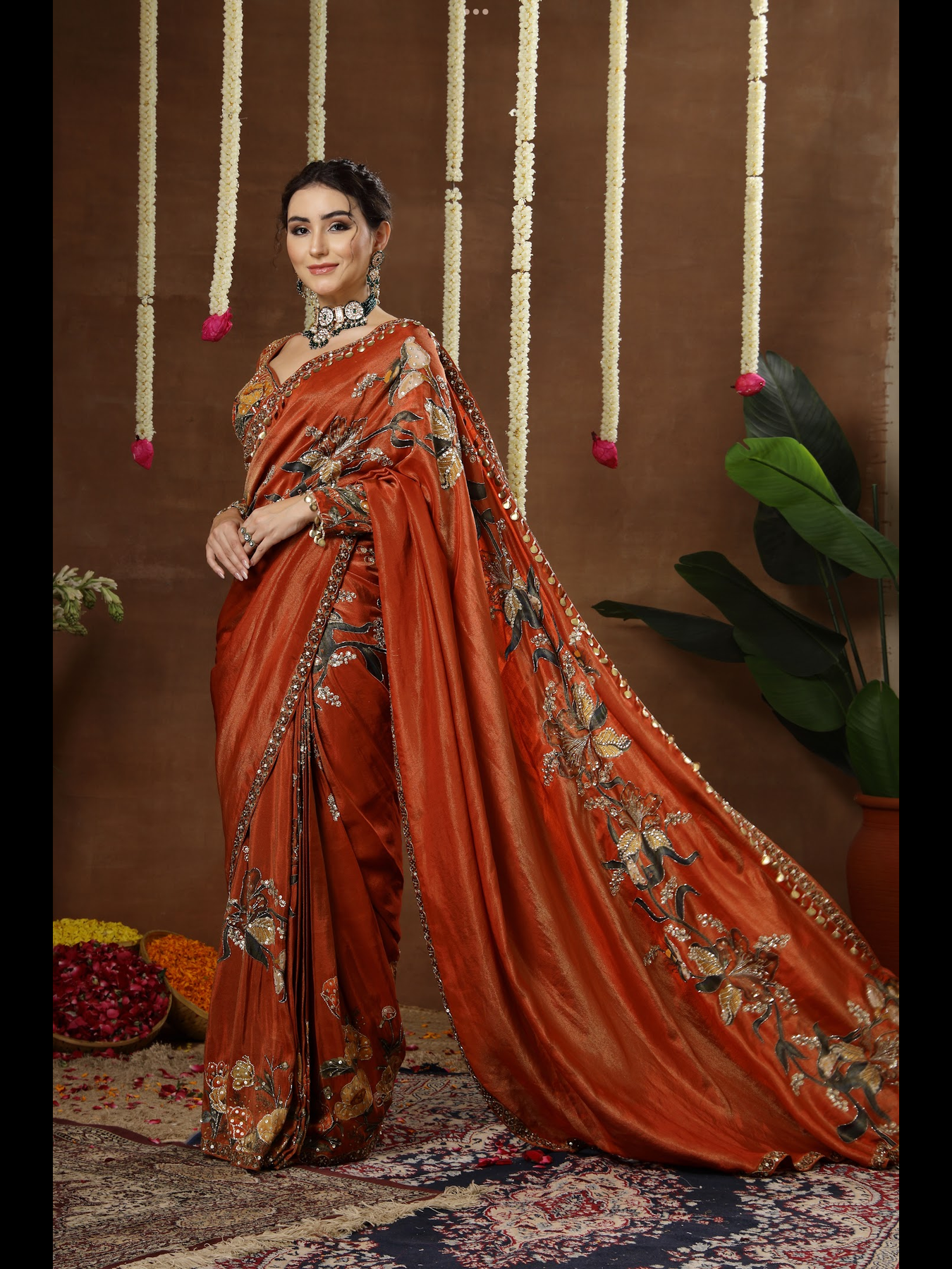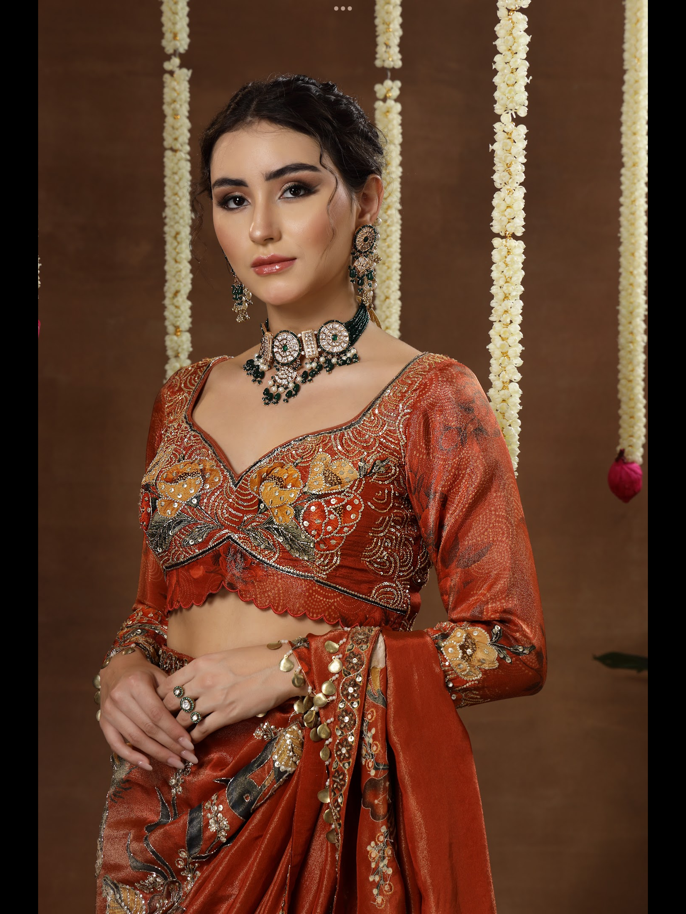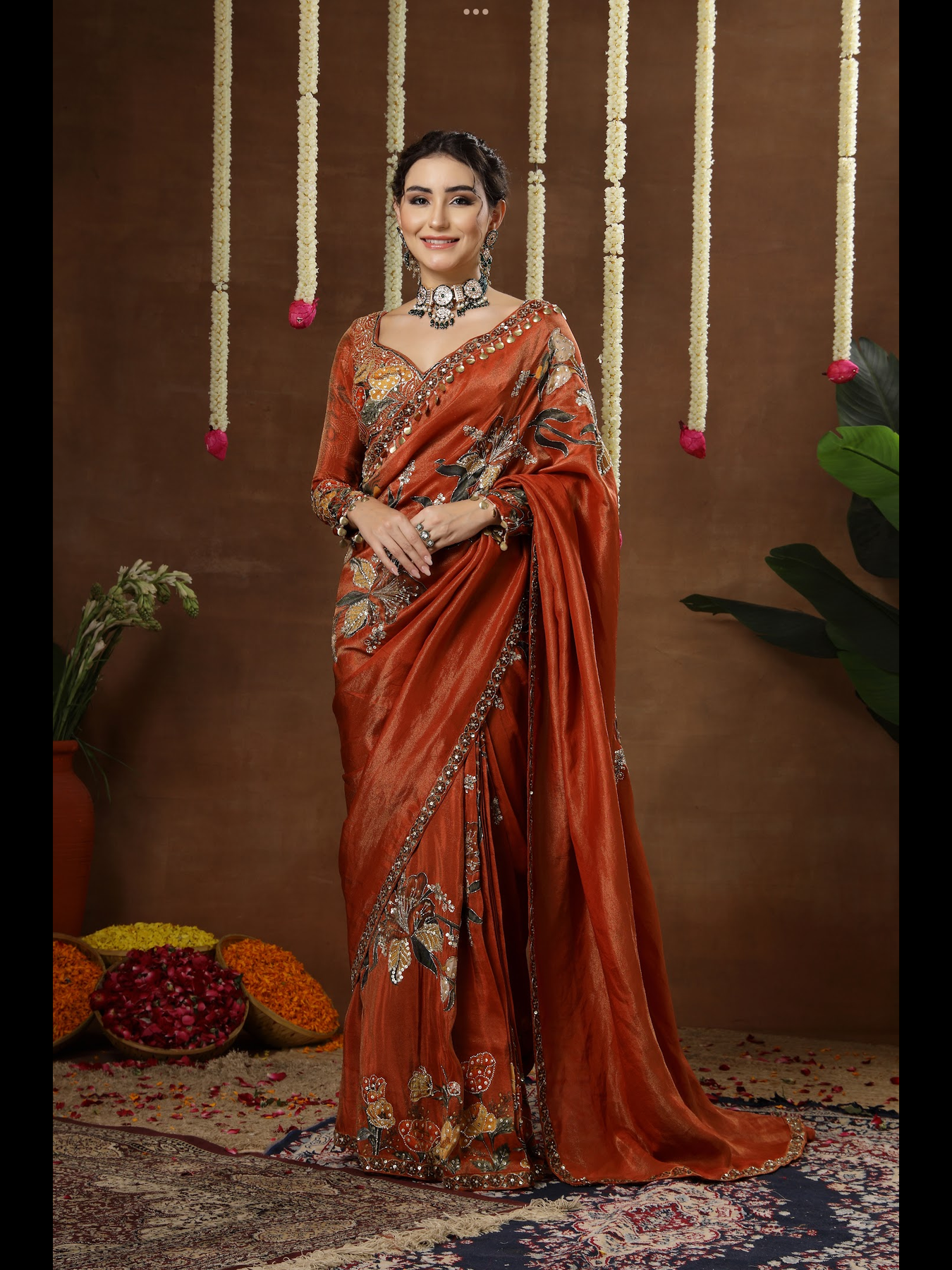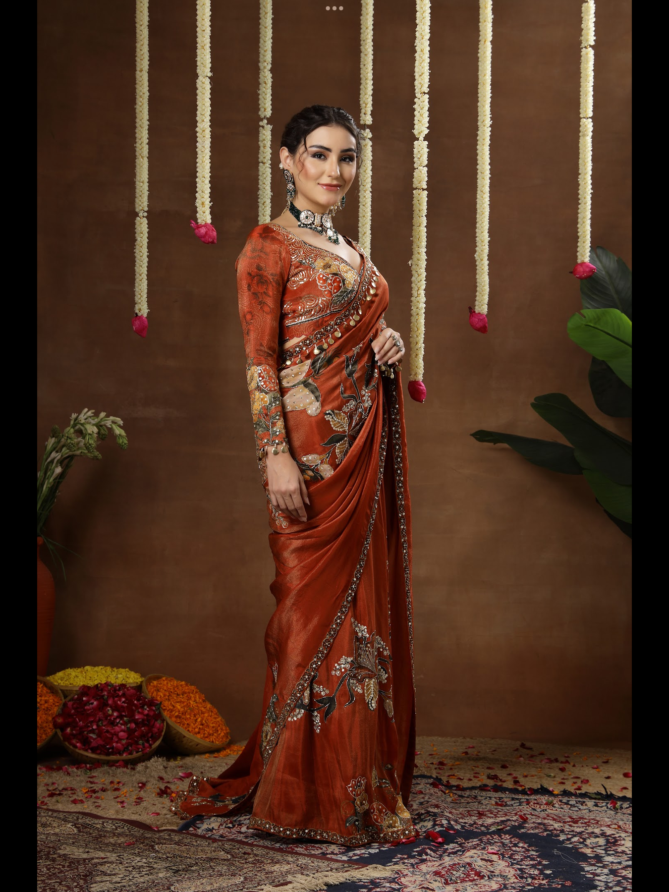 A modern pre-draped saree teamed with a beautifully designed blouse. The outfit showcases intricate hand embroidery throughout, while the palla is adorned with exquisite embellishments that add a touch of glamour.